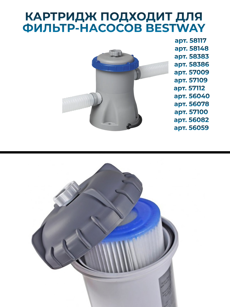 Сменный фильтр-кардридж для фильтрующего насоса (предназначен для очистки воды в надувных и каркасных бассейнах Bestway, а так же в надувных джакузи), без труда и быстро меняется. Простая конструкция, легко чистится.