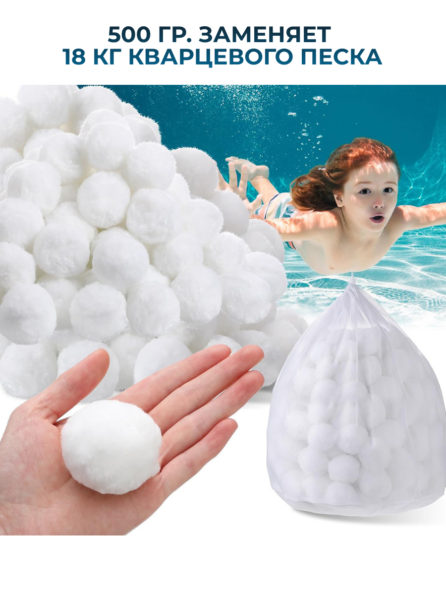 Наполнитель для песчаного фильтра Fiber Ball используется для очистки воды в фильтрах-насосах для бассейна. Это отличная альтернатива кварцевому песку: высокая эффективность фильтрации, эргономичность и возможность многократного использования после стирки шариков.