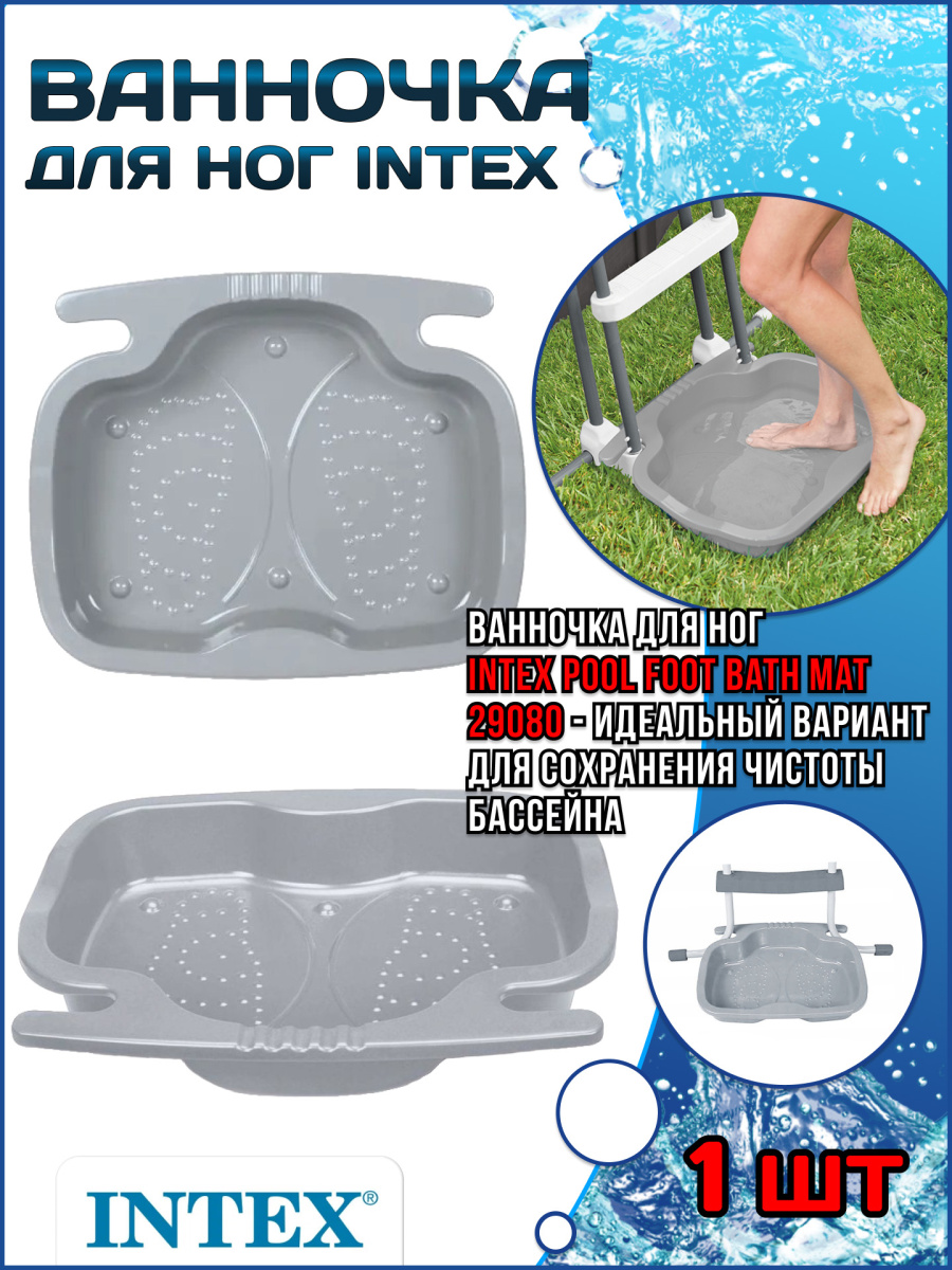 Ванна для ног Intex Pool Foot Bath Mat 29080 – это удивительно удобная вещь. Поставьте ее возле бассейна и перед купанием помойте свои ножки. Уверяем вас, это простая и несложная процедура сохранит чистоту воды в бассейне значительно лучше любых химических средств очистки. И, разумеется, ванночку для ног можно использовать не только в качестве аксессуара к бассейну.