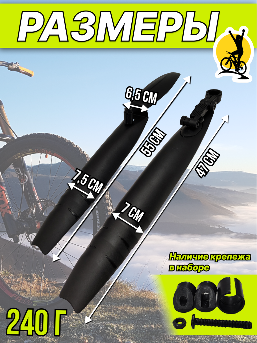 Крылья для велосипедов с колёсами 26 дюймов. Закрепляются на велосипеде посредством винтов, спереди – к горилле, сзади – к подседельному штырю. Заднее крыло регулируется по высоте и наклону.