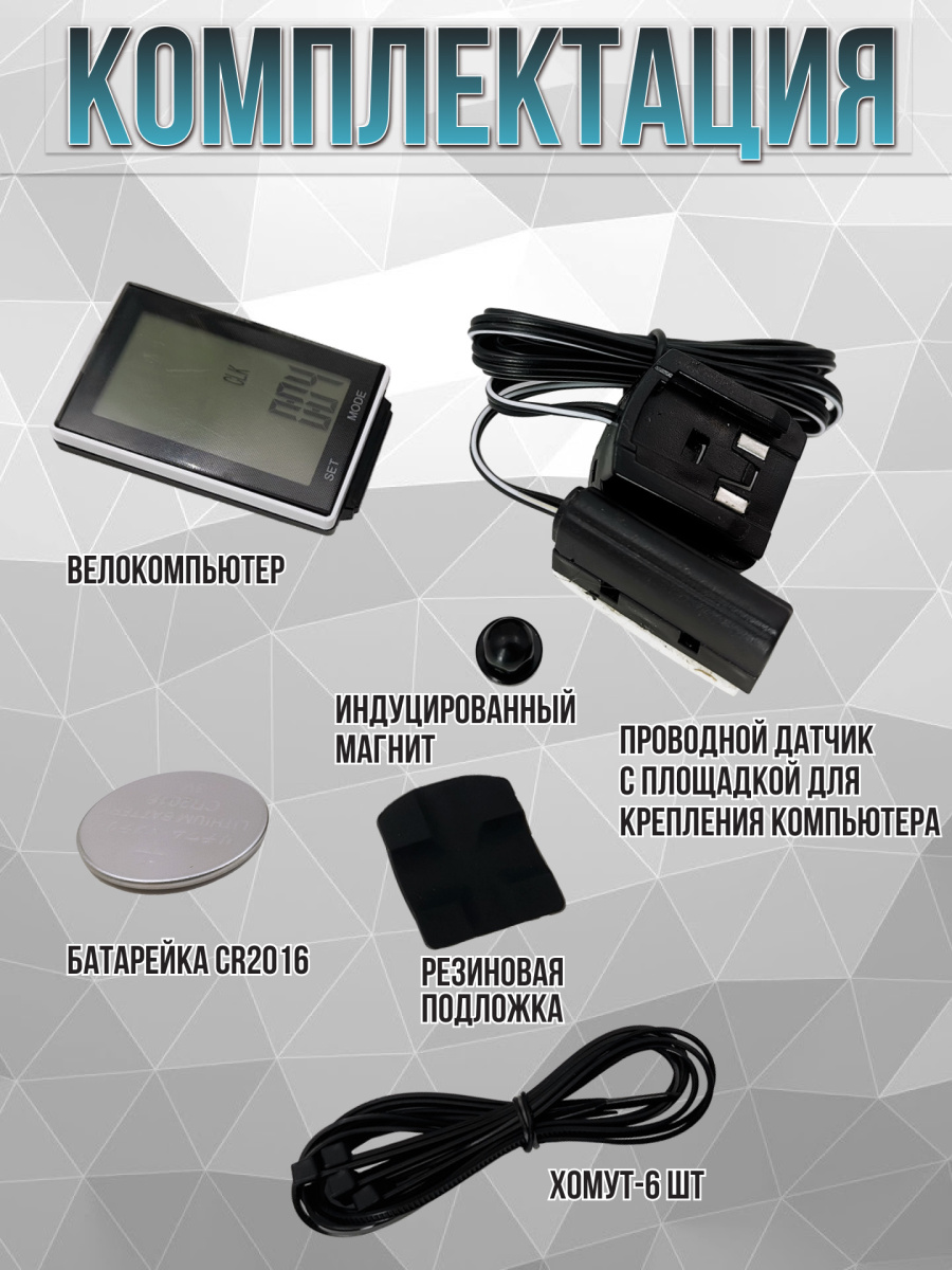 Велокомпьютер JY-M19-CL проводной, 15 функций, 1 батарейка CR2016 в комплекте. Недорогой беспроводной велокомпьютер JY-M19-CL поможет отследить массу интересных статистических параметров ваших заездов и составить общий план тренировок. Компьютер предоставляет 15 функций: текущая скорость, часы, скан функций, секундомер, дистанция поездки, общая дистанция, время поездки, средняя скорость, максимальная скорость, расход калорий, температура, изменение средней скорости, напоминание об обслуживании, подсветка, автовыключение. В комплекте есть крепежные хомуты- 6 шт, проводной датчик вращения колеса с магнитом и с площадкой для крепления компьютера. Компьютер велосипедный - это полезный гаджет для любого велосипедиста, которому нужен удобный способ следить за параметрами езды. С его помощью вы легко сможете отслеживать текущую скорость, пробег и многое другое.