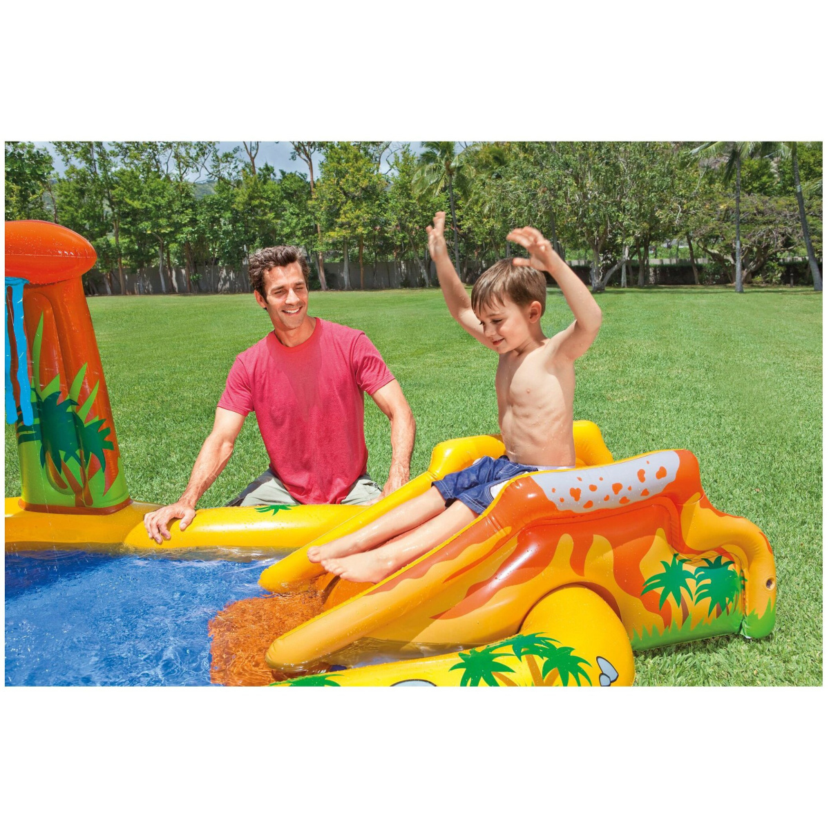 Детский бассейн с горкой INTEX 57444 Динозавр от компании Интекс (57444) имеет все необходимое для купания и игр ваших малышей в жаркие летние дни. Игровой бассейн снабжен горкой для спуска в воду, мини-бассейном и угловой крышей с водопадом. Всю эту композицию прекрасно дополняют изображения мордочек динозавров!