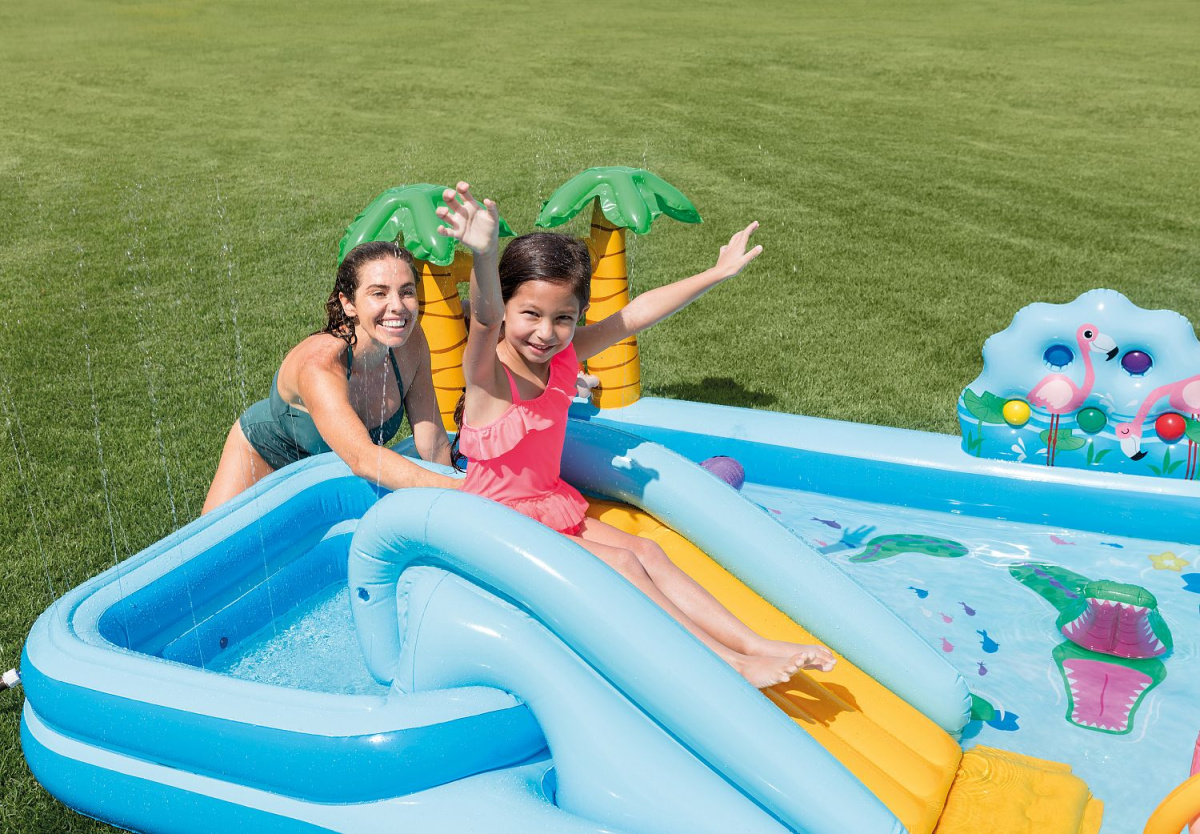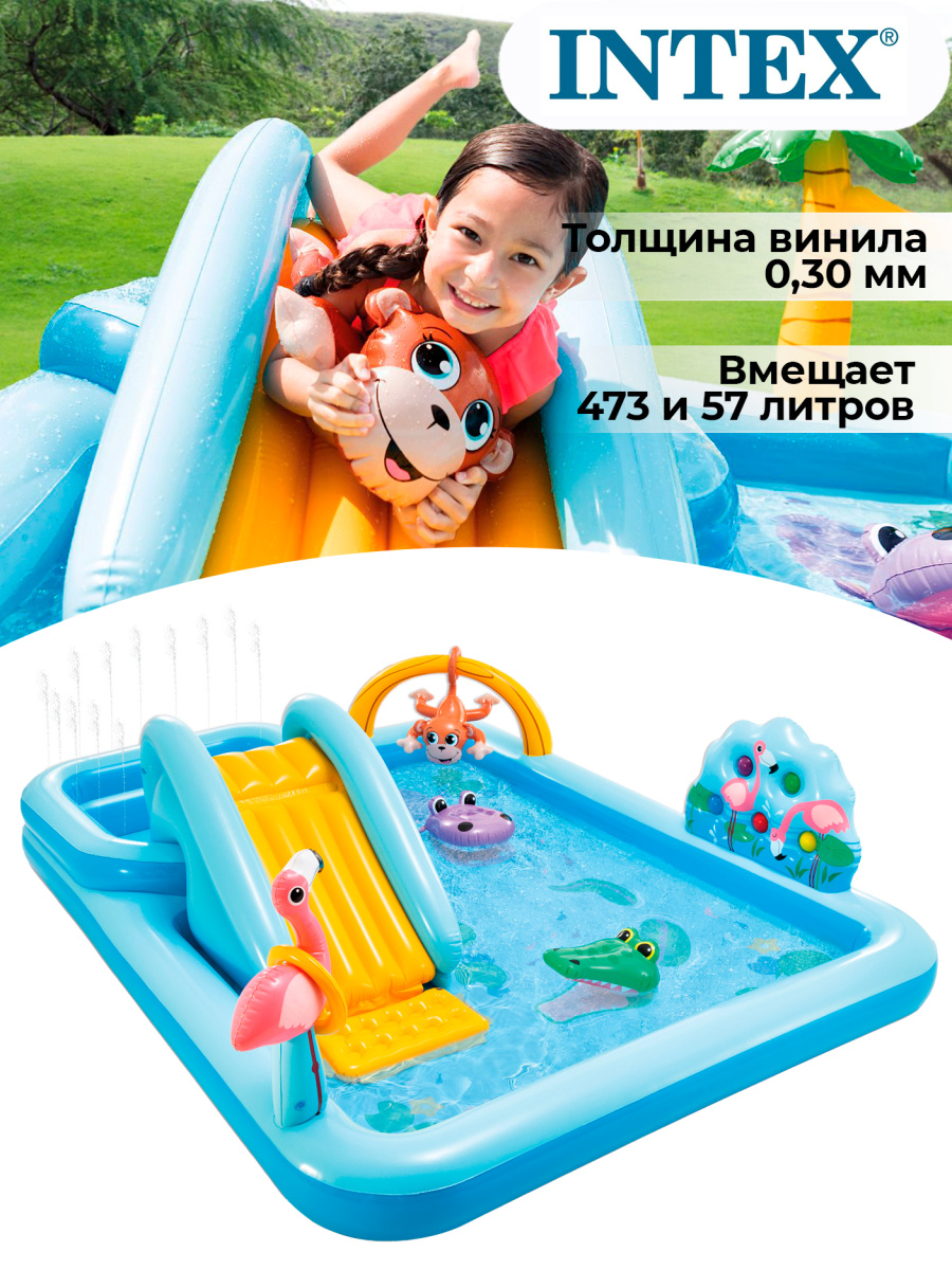 Детский игровой бассейн Интекс- это надувная горка с бортиками, озорная обезьянка, крокодил, бегемот и фламинго, который может использоваться в качестве кольцеброса. Горка заканчивается надувной подушкой, чтобы дети не ударились о землю. Неоспоримым плюсом водного игрового центра являются два бассейна разной величины. В комплекте 5 пластмассовых мячиков разных цветов, которые могут храниться в надувном элементе на бортике большого бассейна.