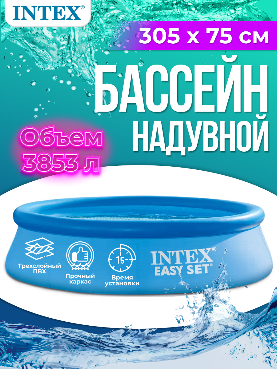 Надувной бассейн Intex 305*76 см - модель синего цвета с непрозрачными стенками. Оригинальность конструкции позволяет очень легко его устанавливать. Вы просто расправляете чашу аккуратно на земле, наполняете воздухом верхнее кольцо и начинаете заливать в круглый надувной бассейн воду. Кольцо всплывает над водой и поднимает стенки. Просто и гениально! Бассейны Интекс - это лучшее решение для дачи или загородного участка, а серия Intex Easy Set - самая простая в эксплуатации линейка этого бренда, поэтому она уже давно завоевала любовь покупателей.