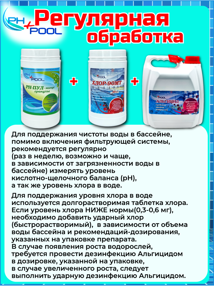 Внимание! При интенсивной эксплуатации, осадках, высоких температурах или появления ледового покрытия в бассейне допустимо увеличить дозировку в 2 раза или проводить обработку чаще.