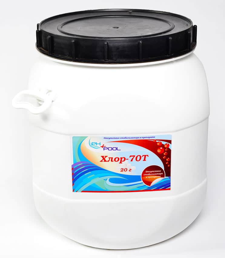 Таблетки Хлор-70Т – препарат нестабилизированного хлора для дезинфекции воды в бассейне. Содержит не менее 70% активного хлора. Не требует взвешивания. Расфасован в ведра.