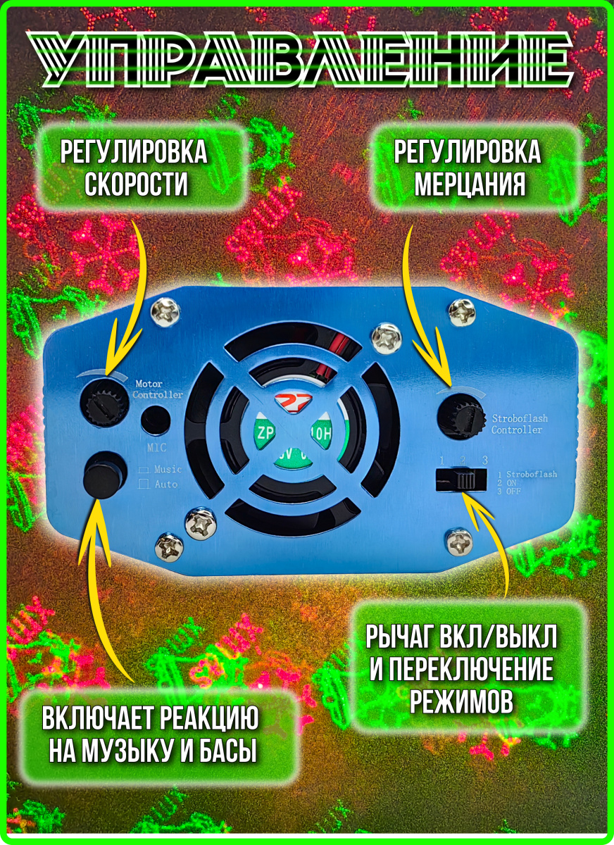 Не упустите шанс сделать ваш праздник еще веселее и интереснее. С помощью проектора вы добъетесь незабываемой атмосферы и получите яркие эмоции. Проектор способен генерировать два цвета лазера: яркий красный и насыщенный зеленый. Он также оснащен режимом стробоскопа, что позволяет создавать еще более захватывающий световой эффект. Компактный размер устройства делает его удобным для использования в различных помещениях — от уютной квартиры до многолюдного кафе.