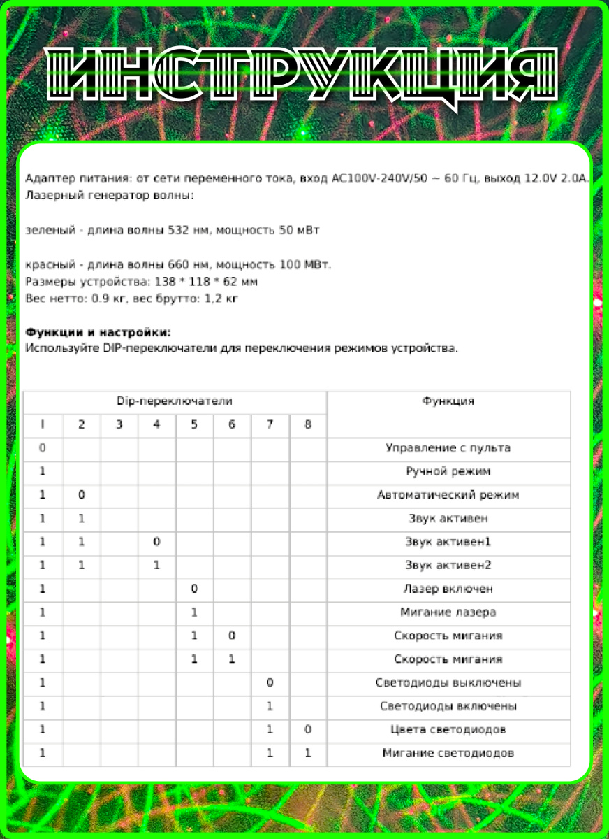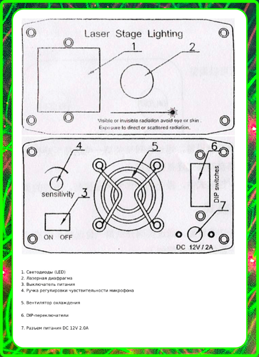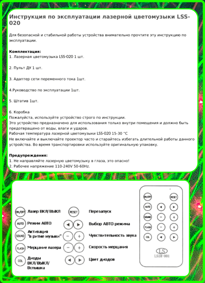 Данная модель Laser Stage Lighting LSS-020 оснащена 9 светодиодами, которые образуют фон для лазерных узоров, то есть не оставляет пустот. Цвета диодов меняются и отлично дополняют образуемый эффект. На пульте есть кнопка включения и выключения этой функции.