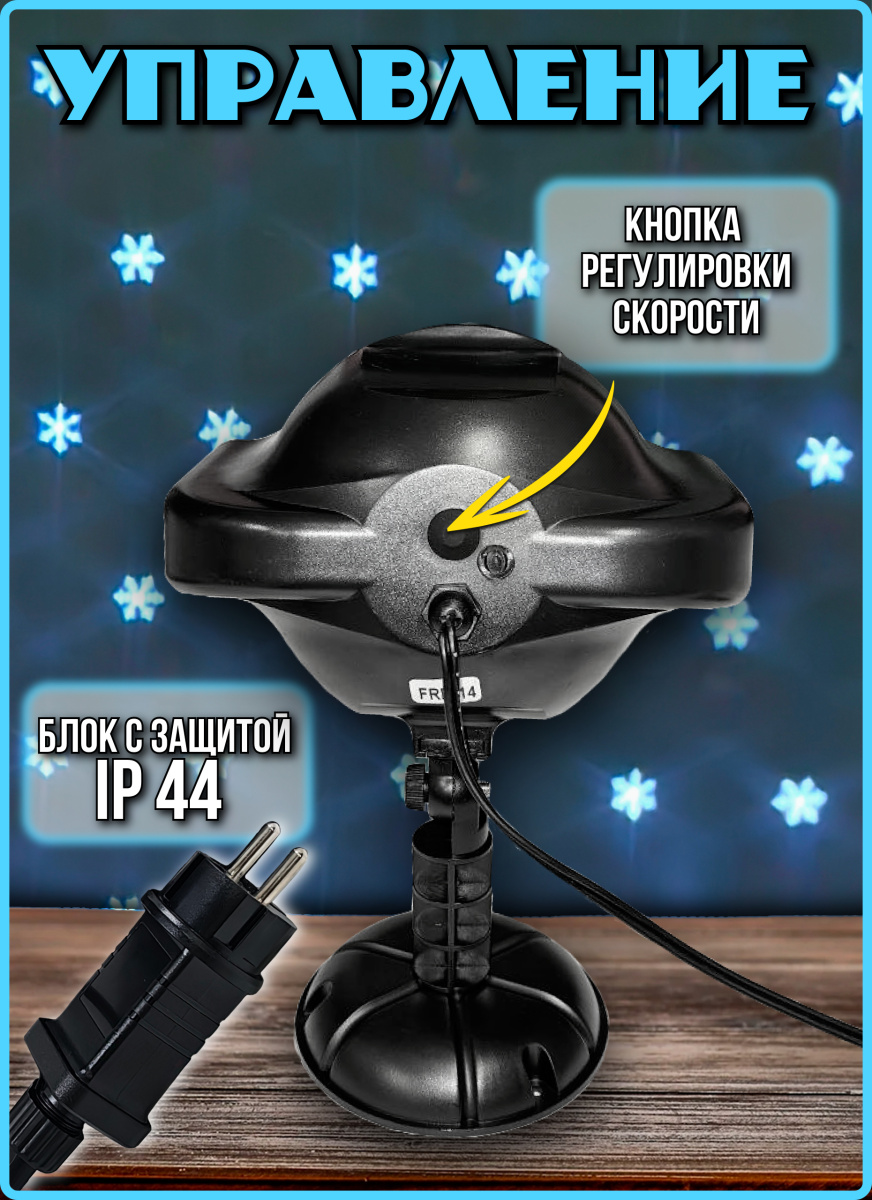 Проектор имеет 3 скорости перетекания и 1 режим полной остановки. Его можно использовать в качестве ночника в помещении или направить на фасад дома. Светодиодный светильник снегопада имеет степень защиты IP44, водонепроницаем, поэтому подходит для украшения на открытом воздухе, создавая приятные вибрации для вечеринок и развлечений, подходит для Нового года, Рождества, Дня независимости, дня рождения и так далее. Кнопка переключения режимов находится на задней стороне проектора. Свет снегопада голубой.