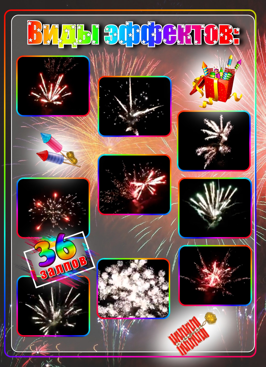Ваш праздник украсят 36 залпов калибром 1", радуя вас эффектами. Незабываемые 36 секунд впечатляющего пиротехнического шоу!