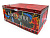 Огромная батарея салютов в огненном дизайне! Размеры батареи 55х37х23 см. Упаковка выполнена из яркого двустороннего картона. С одной стороны упаковки по бокам пылает яркий огонь с красными, жёлтыми и голубыми языками пламени, которым не терпится вырваться наружу. В середине изображён ночной город и разноцветные салюты над ним. С другой стороны упаковки также видны языки пламени трёх цветов, а в центре – образ человека, в руках которого горит яркий жёлто-красный огонь.