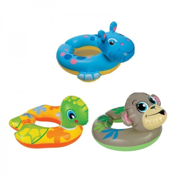 Яркий забавный круг оформлен в виде симпатичных зверюшек трех видов. Круг с разъемной конструкцией. Ребенку не придется надевать его через голову, нужно просто слегка раздвинуть надувные плавники и влезть внутрь.