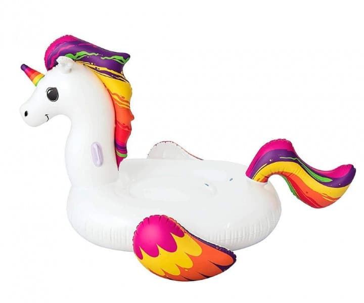 Хотите насладиться незабываемым отдыхом в бассейне или на море? Большой надувной единорог к вашим услугам! Сказочный красавец с радужными хвостиком и гривой с удовольствием прокатит вас, вам нужно лишь устроиться на его спинке между ярких крыльев. Ручки из прочного пластика и три воздушные камеры обеспечат дополнительную безопасность и удобство. Матрас остров можно также использовать на суше в качестве оригинального удобного лежака.