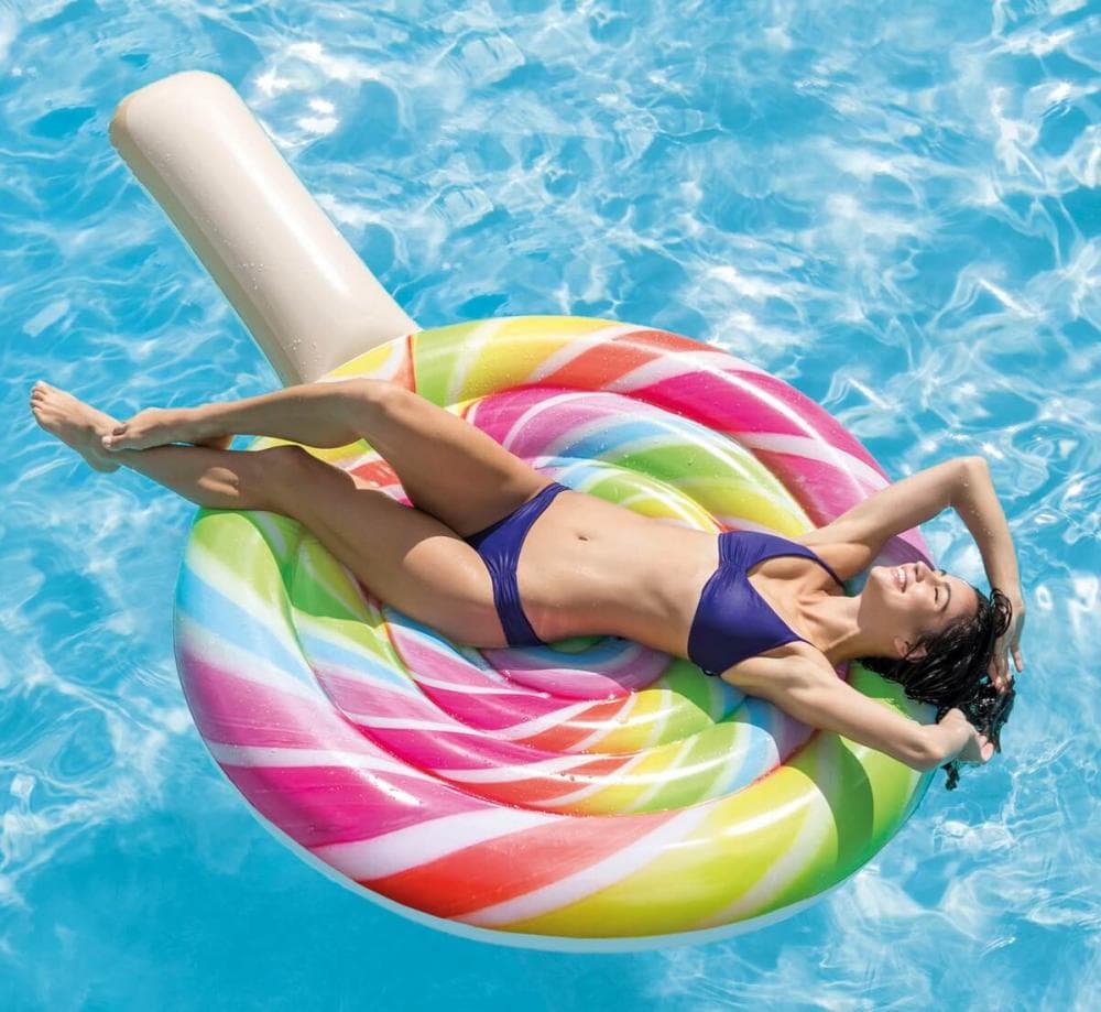 Большой надувной матрас для купания, выполненный в форме яркого леденца на палочке - оригинальная идея, которая порадует всех любителей пляжного отдыха. Красочный и яркий надувной плот, который станет отличным аксессуаром на пляже или у бассейна! Вы можете использовать его для плавания в бассейне, на море, на речке или отдыха на пляжу. В наше время стало очень модным делать фотографии с причудливыми надувными кругами или плотиками с ярким и неповторимым дизайном!