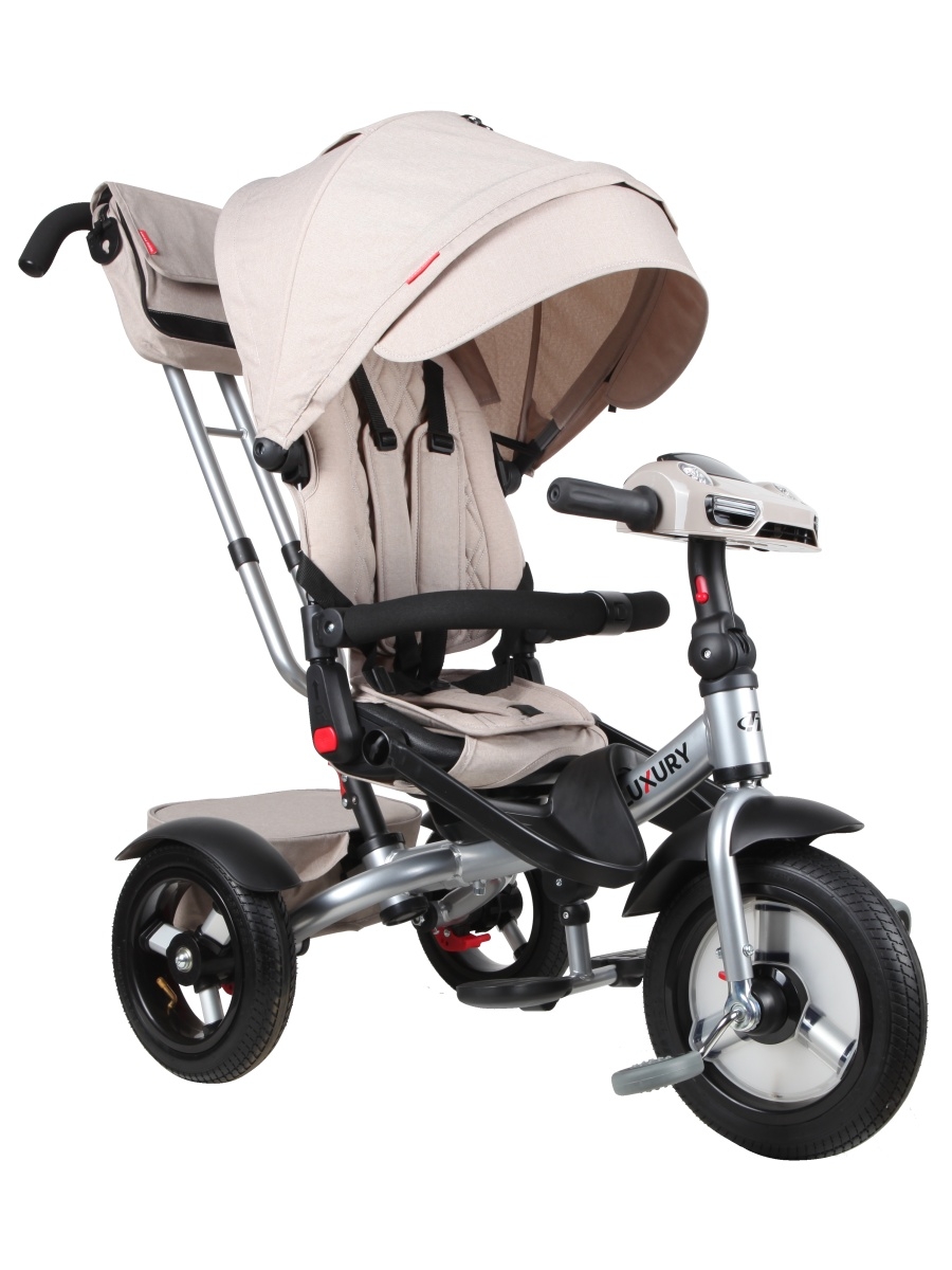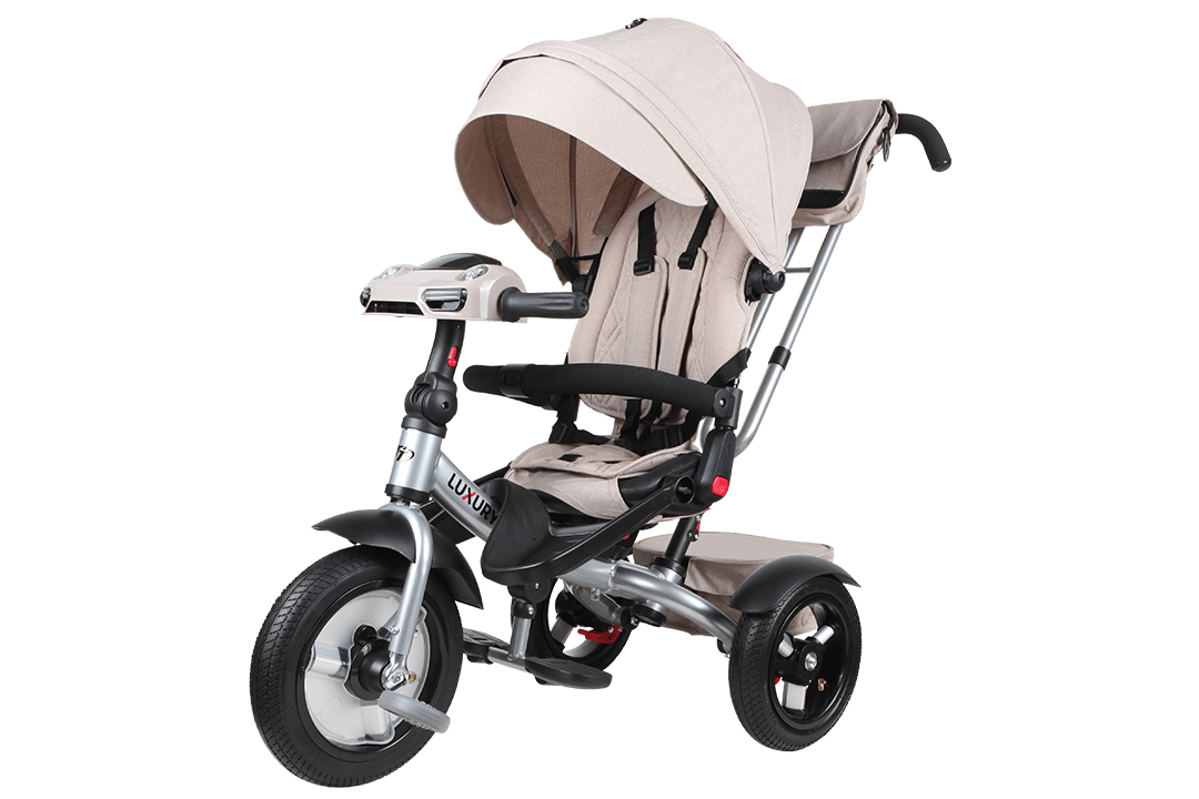 Luxury - усовершенствованная модель популярного детского трехколесного велосипеда-коляски для малышей с ручкой. Большие надувные колеса обеспечивают хорошую проходимость, поэтому малыш сможет крепко спать, пока коляска плавно едет под управлением родителей. Во время бодрствования ребенок не будет скучать благодаря не раздражающим музыкальным и световым сигналам.