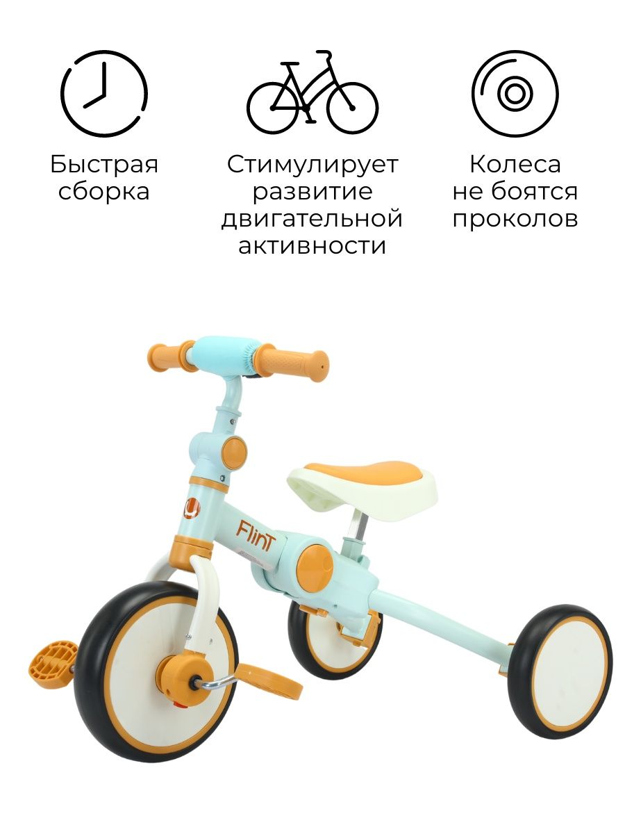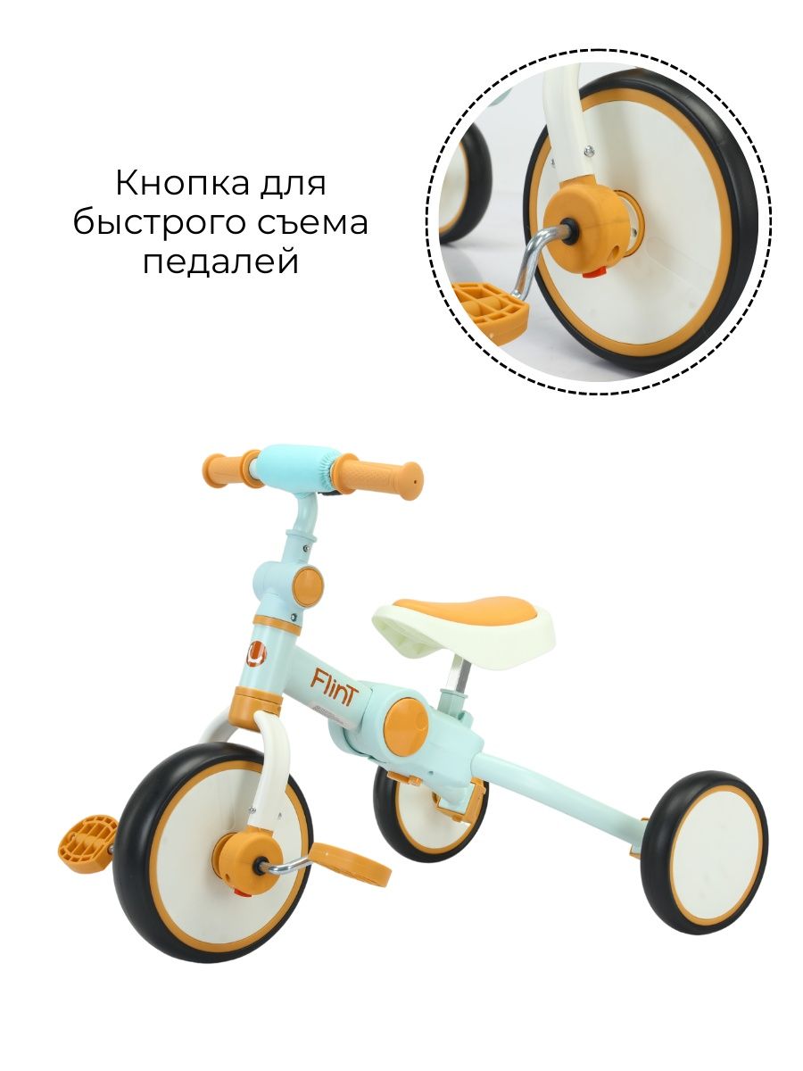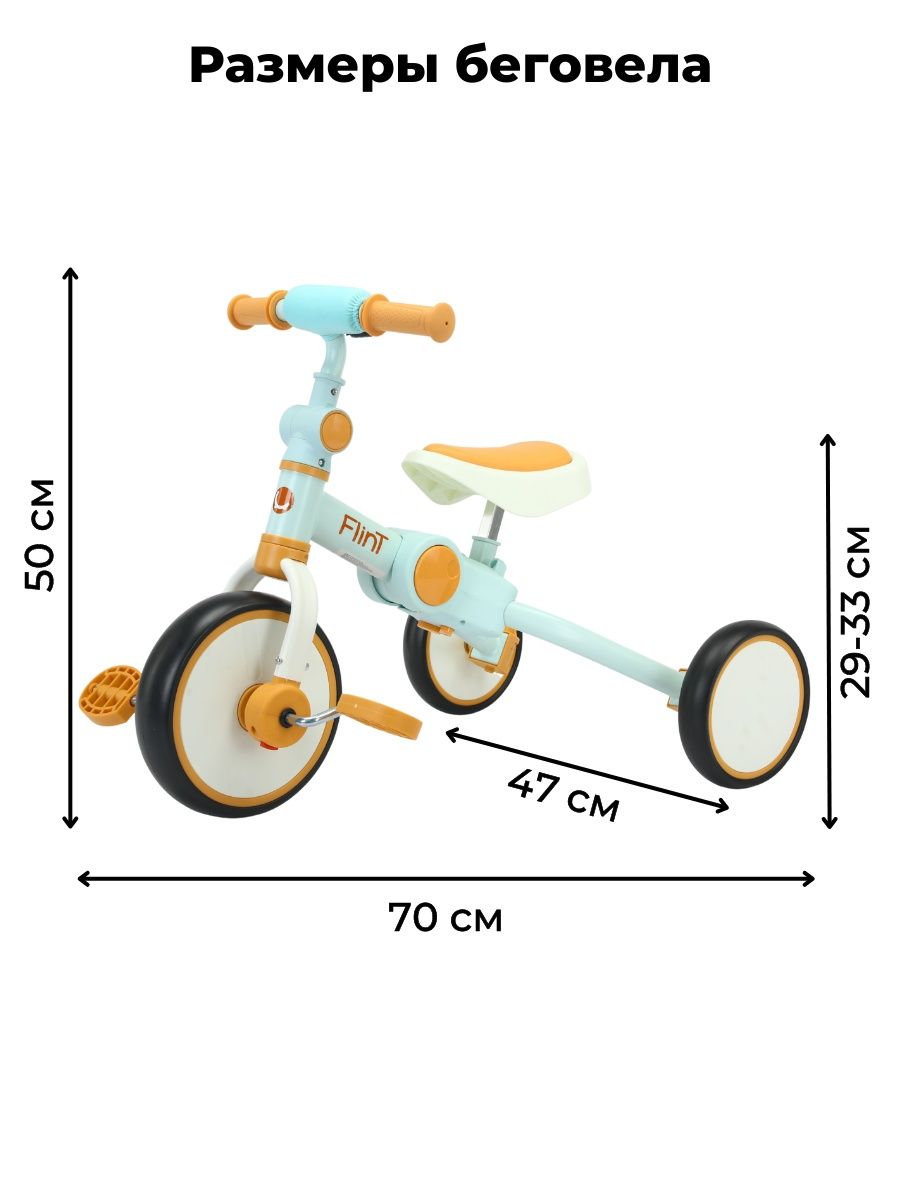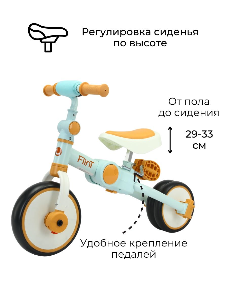 Для безопасности малыша предусмотрен режим холостого хода у педалей, поворот переднего колеса ограничен 20 градусами и прорезиненные ручки на руле для надежного хвата руля. Телескопическая родительская съемная ручка, которая подойдет под любой рост. Сиденье регулируется по высоте и подходит как для мальчиков, так и для девочек. Простой механизм трансформации и небольшие габариты в сложенном виде позволят брать беговел Flint на каждую прогулку или в дорогу.