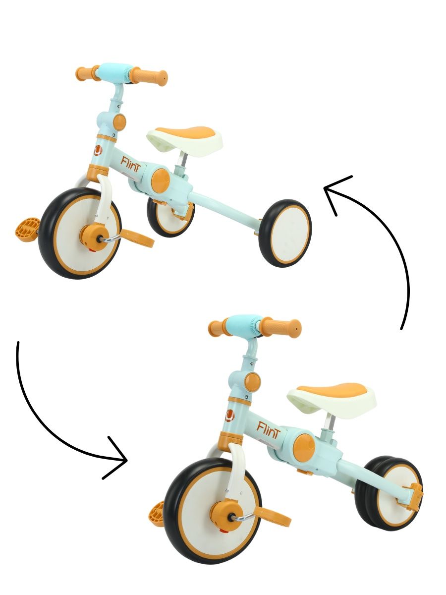• Трансформер 4 в 1: двухколесный, трехколесный беговел и двухколесный или трёхколесный велосипед;