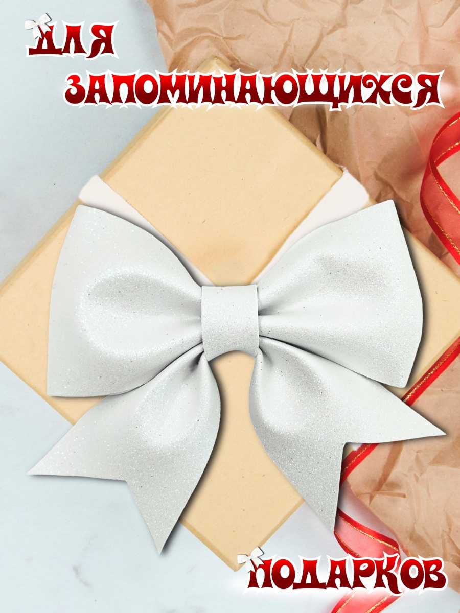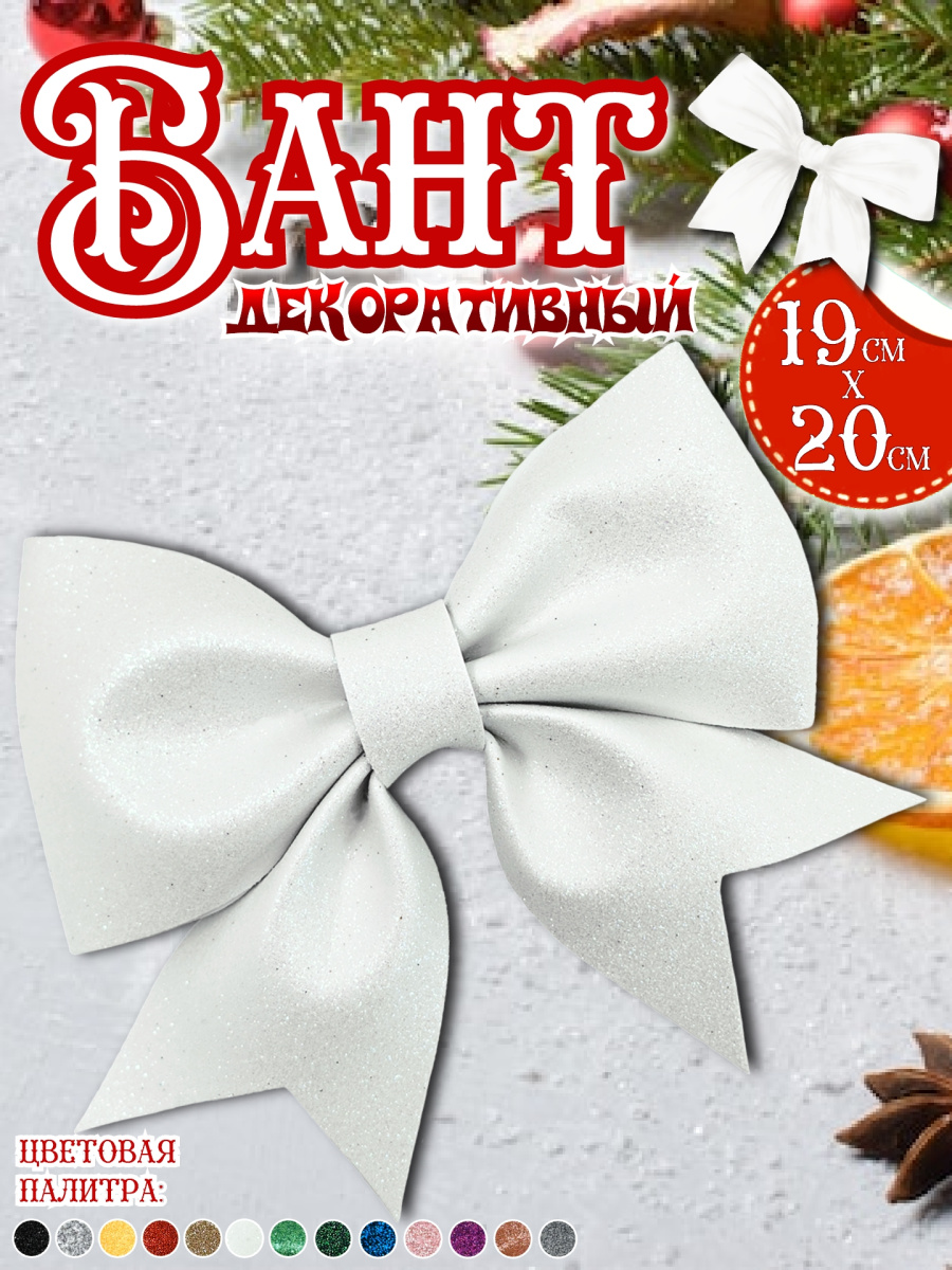 Декоративный бант "Елочные сказки" из фоамирана станет прекрасным дополнением к вашему декору, на праздник, торжество или просто для души. Этот рельефный бант с острыми очертаниями из плотного и блестящего фоамирана придаст праздничное настроение любому интерьеру. Его нежно-белый цвет, покрытый переливающимся глитером хамелеон и праздничный дизайн в виде банта, идеально впишутся в общую тематику праздника. Бант можно использовать как украшение для елки, интерьера и просто для создания акцентных элементов, создавая атмосферу уюта и волшебства. Также, подойдет для украшения подарочных коробок. Фоамиран — это мягкий, легкий, пластичный полимерный материал, его ключевыми характеристиками являются гибкость, плотность и разнообразие цветов. Данный материал не теряет цвет и не деформируется со временем, поэтому ваш бант долго будет радовать вас своей красотой. Бант имеет выпуски из декоративной проволоки для удобного крепления +- 10 см.