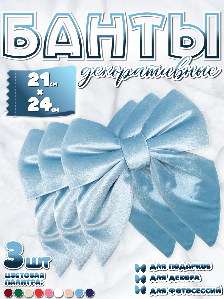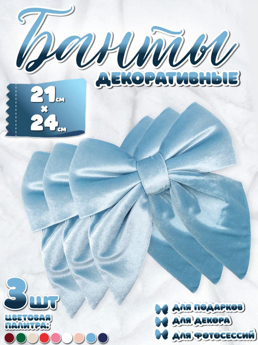 Набор декоративных бантов "Елочные сказки"- 3 шт, станет прекрасным дополнением к вашему декору, на праздник, торжество или просто для души. Эти изящные банты из мягкого велюра, с подложкой из вспененного полиэтилена, придадут праздничное настроение любому интерьеру. Их нежный голубой цвет и дизайн в виде банта, идеально впишутся в общую тематику праздника. Банты можно использовать как украшение для елки, для волос, для создания акцентных элементов одежды, а также для декора дома, мебели, создавая атмосферу уюта и волшебства. Также, подойдут для украшения подарочных коробок. Для использования в интерьере, для одежды и волос, требуется дополнительное крепление (в комплект не входит).