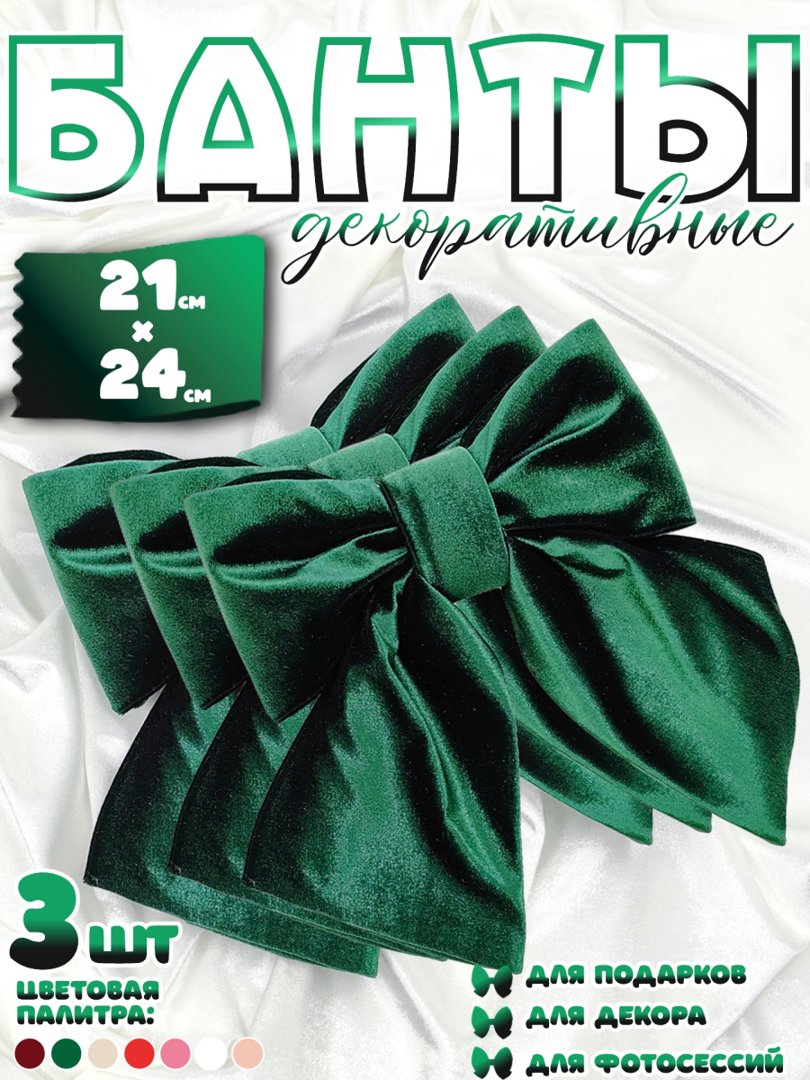 Набор декоративных бантов "Елочные сказки"- 3 шт, станет прекрасным дополнением к вашему декору, на праздник, торжество или просто для души. Эти изящные банты из мягкого велюра, с подложкой из вспененного полиэтилена, придадут праздничное настроение любому интерьеру. Их богатый темно-зеленый цвет и дизайн в виде банта, идеально впишутся в общую тематику праздника. Банты можно использовать как украшение для елки, для волос, для создания акцентных элементов одежды, а также для декора дома, мебели, создавая атмосферу уюта и волшебства. Также, подойдут для украшения подарочных коробок. Для использования в интерьере, для одежды и волос, требуется дополнительное крепление (в комплект не входит).