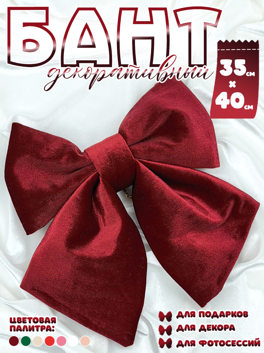 Декоративный бант "Елочные сказки" станет прекрасным дополнением к вашему декору, на праздник, торжество или просто для души. Этот изящный бант из мягкого велюра, с подложкой из вспененного полиэтилена, придаст праздничное настроение любому интерьеру. Его богатый бордовый цвет и дизайн в виде банта, идеально впишутся в общую тематику праздника. Бант можно использовать как украшение для елки, для создания акцентных элементов одежды, а также для декора дома, мебели, создавая атмосферу уюта и волшебства. Также, подойдет для украшения подарочных коробок. Для использования в интерьере, для одежды, требуется дополнительное крепление (в комплект не входит).