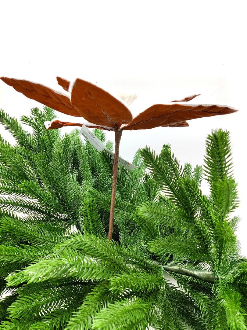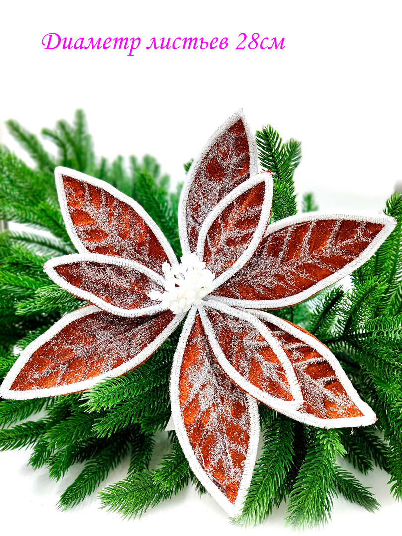 Новогодний декор в виде бантика, ленты, бус, цветов и веток украсит интерьер дома или офиса в преддверии Нового года. Оригинальный дизайн и красочное исполнение создадут праздничное настроение. Новогодние украшения всегда несут в себе волшебство и красоту праздника. Создайте в своем доме атмосферу тепла, веселья и радости, украшая его всей семьей.Диаметр листьев в развернутом виде до 28 см.