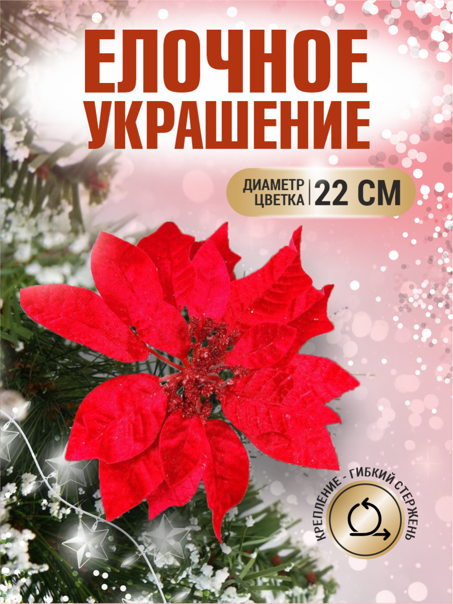 Новогодний декор в виде бантика, ленты, бус, цветов и веток украсит интерьер дома или офиса в преддверии Нового года. Оригинальный дизайн и красочное исполнение создадут праздничное настроение. Новогодние украшения всегда несут в себе волшебство и красоту праздника. Создайте в своем доме атмосферу тепла, веселья и радости, украшая его всей семьей.Диаметр листьев в развернутом виде до 22 см.