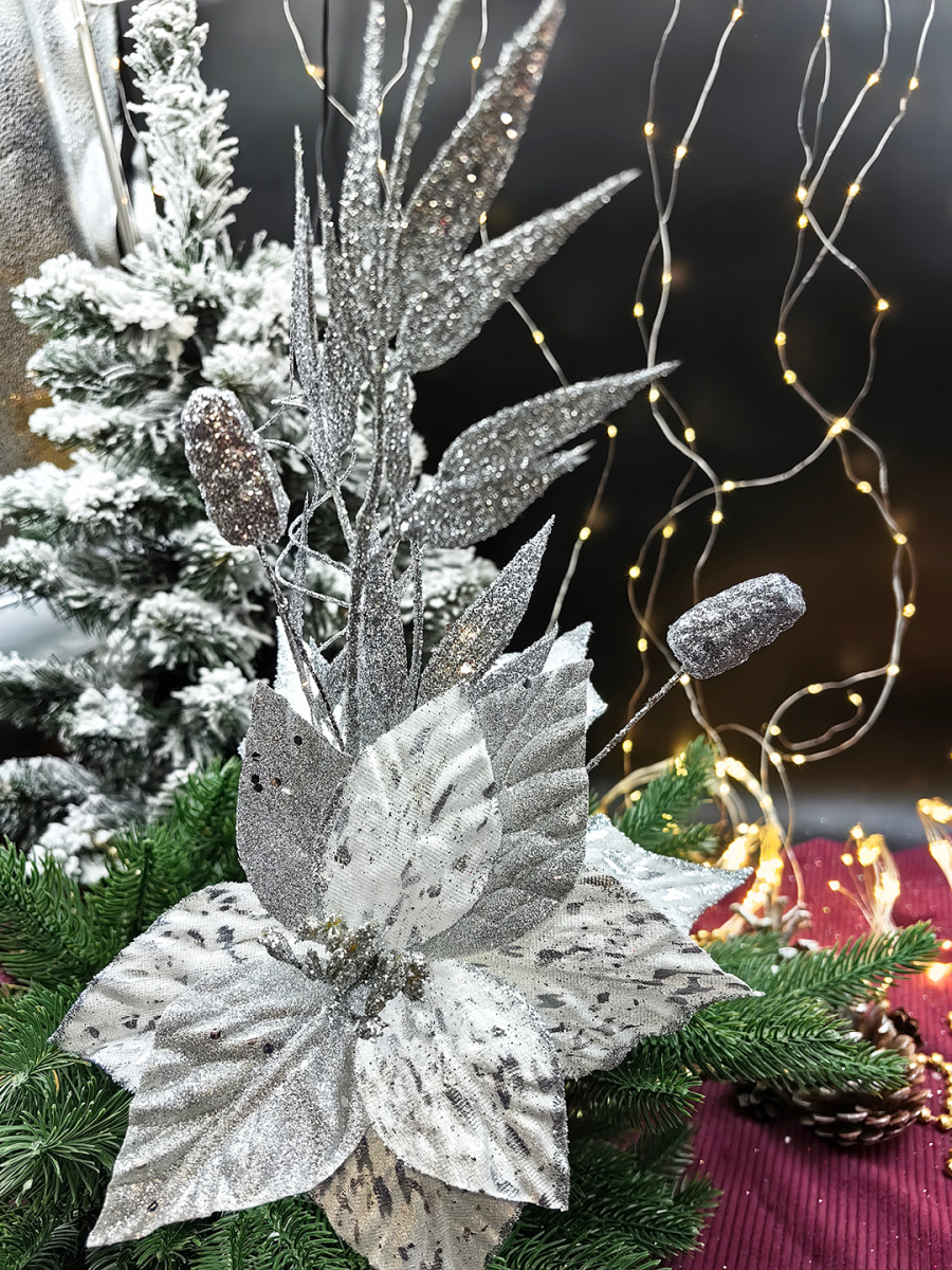 Размеры: сам цветок диаметром 18 см, длина ножки 19 см, длина веточки в блестках 25 см от центра цветка.