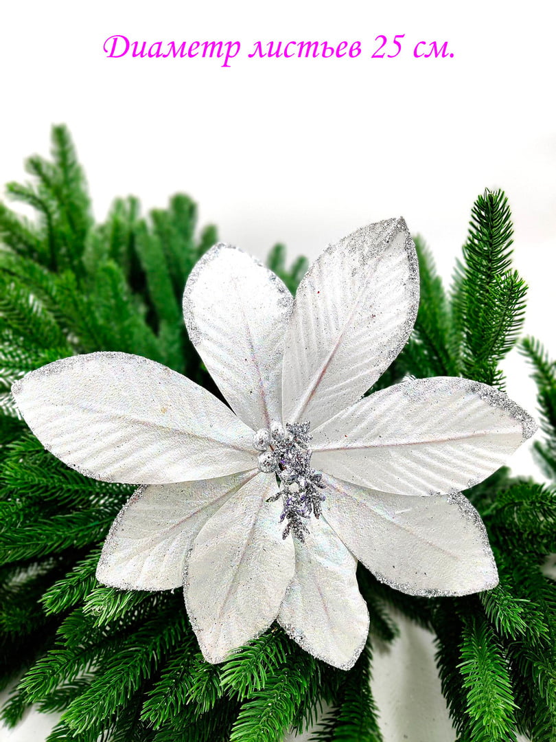 Новогодний декор в виде бантика, ленты, бус, цветов и веток украсит интерьер дома или офиса в преддверии Нового года. Оригинальный дизайн и красочное исполнение создадут праздничное настроение. Новогодние украшения всегда несут в себе волшебство и красоту праздника. Создайте в своем доме атмосферу тепла, веселья и радости, украшая его всей семьей.Диаметр листьев в развернутом виде до 25 см.