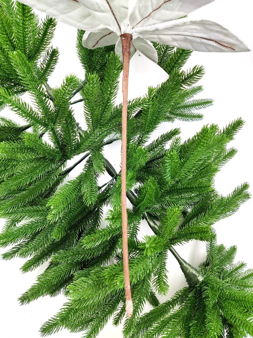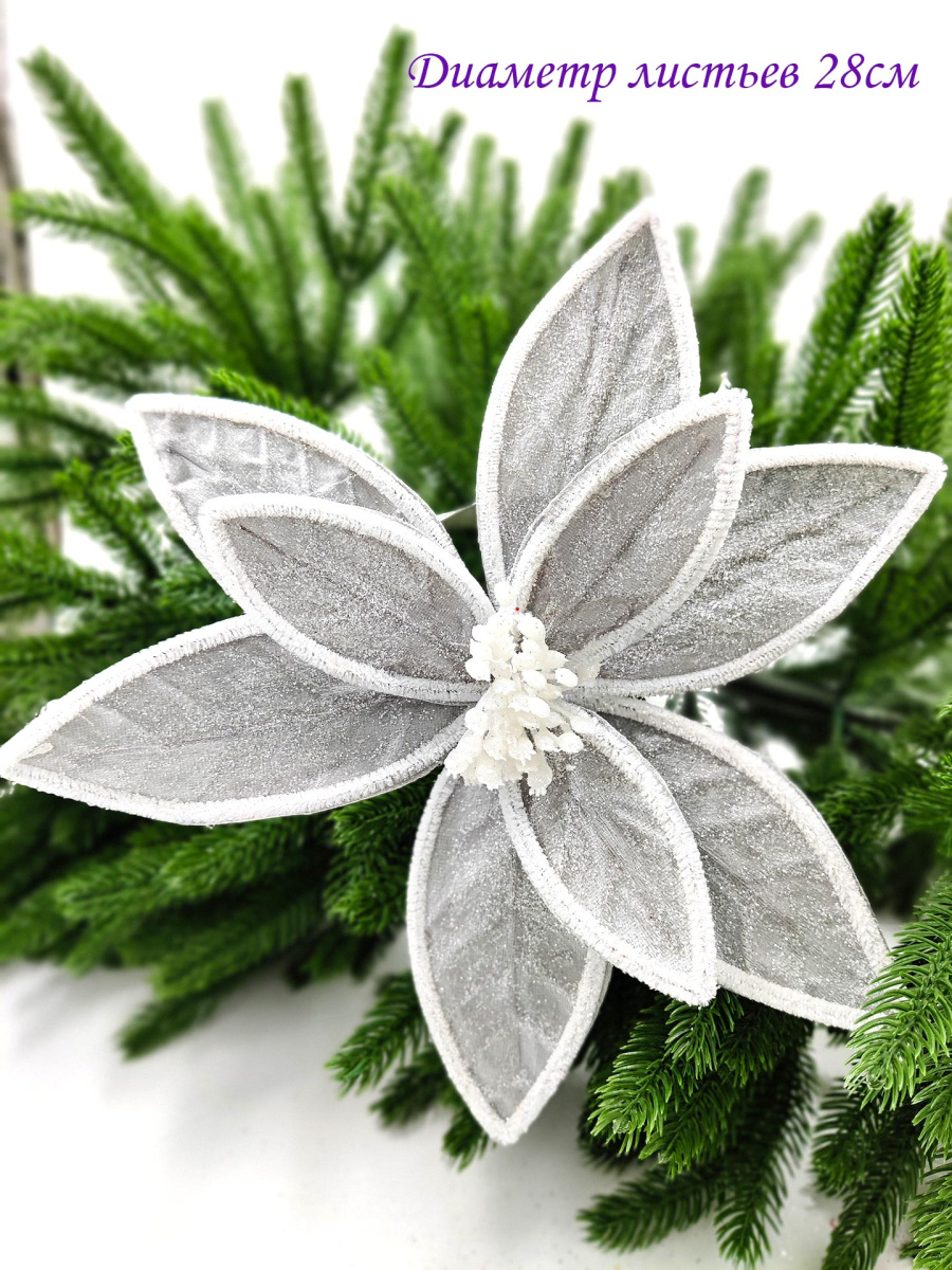 Новогодний декор в виде бантика, ленты, бус, цветов и веток украсит интерьер дома или офиса в преддверии Нового года. Оригинальный дизайн и красочное исполнение создадут праздничное настроение. Новогодние украшения всегда несут в себе волшебство и красоту праздника. Создайте в своем доме атмосферу тепла, веселья и радости, украшая его всей семьей.Диаметр листьев в развернутом виде до 28 см.