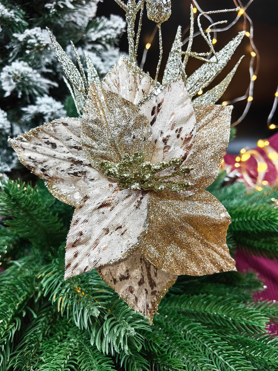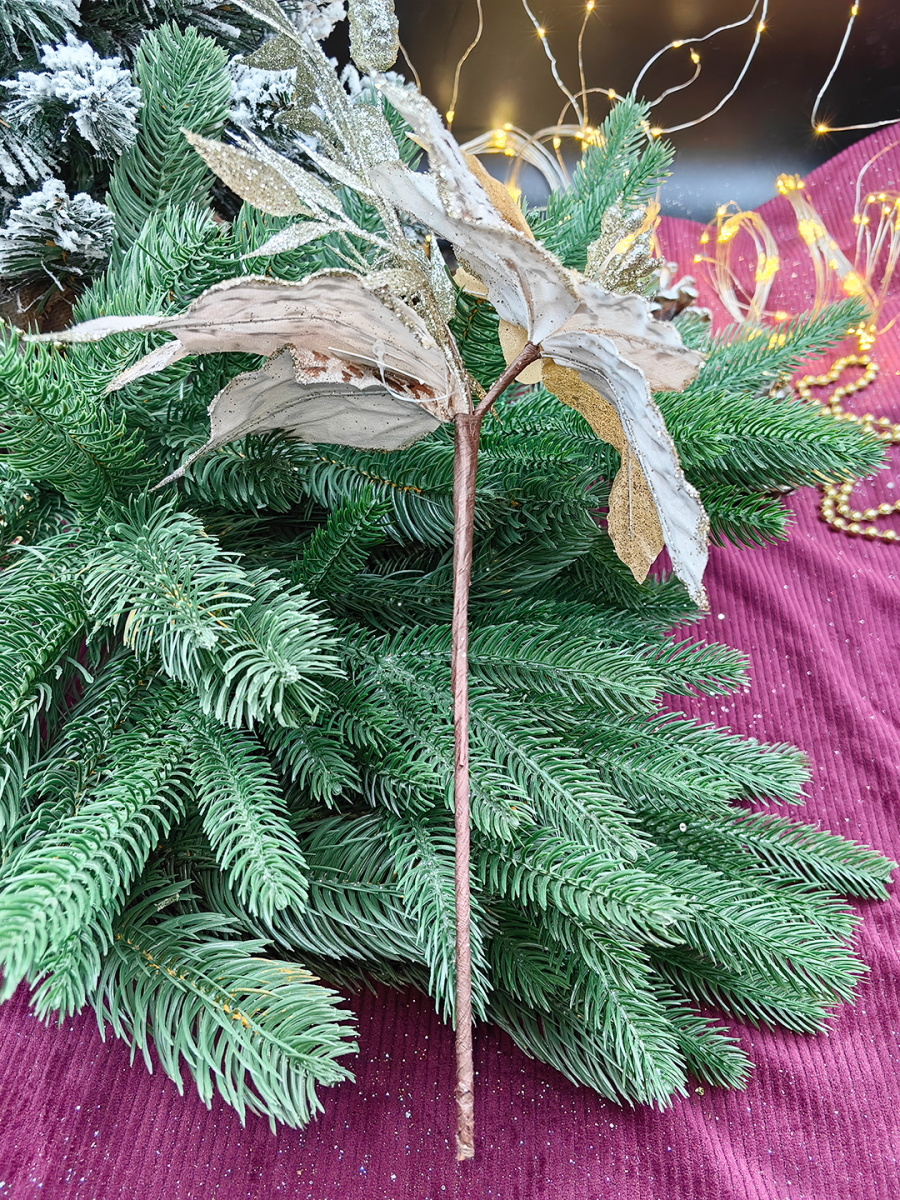 Размеры: сам цветок диаметром 18 см, длина ножки 19 см, длина веточки в блестках 25 см от центра цветка.
