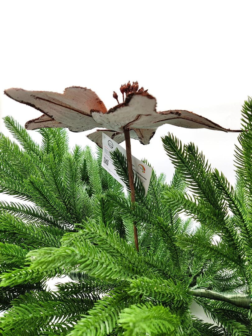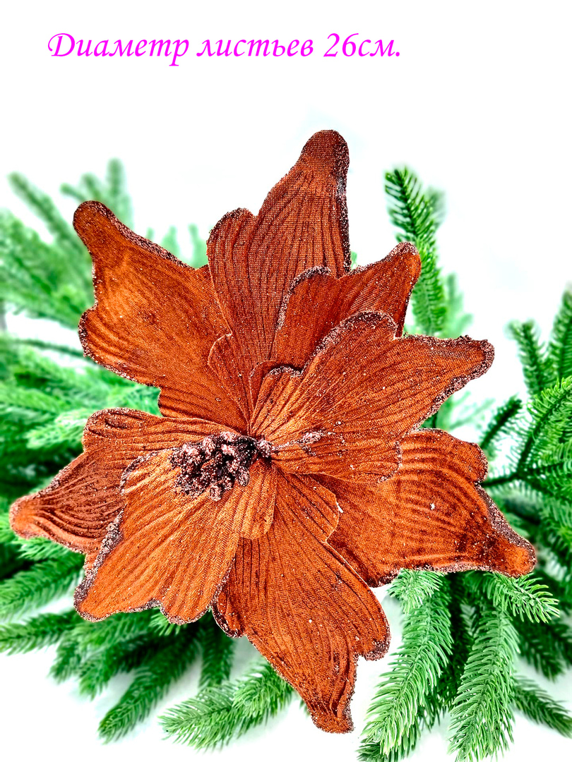 Новогодний декор в виде бантика, ленты, бус, цветов и веток украсит интерьер дома или офиса в преддверии Нового года. Оригинальный дизайн и красочное исполнение создадут праздничное настроение. Новогодние украшения всегда несут в себе волшебство и красоту праздника. Создайте в своем доме атмосферу тепла, веселья и радости, украшая его всей семьей.Диаметр листьев в развернутом виде до 26 см.