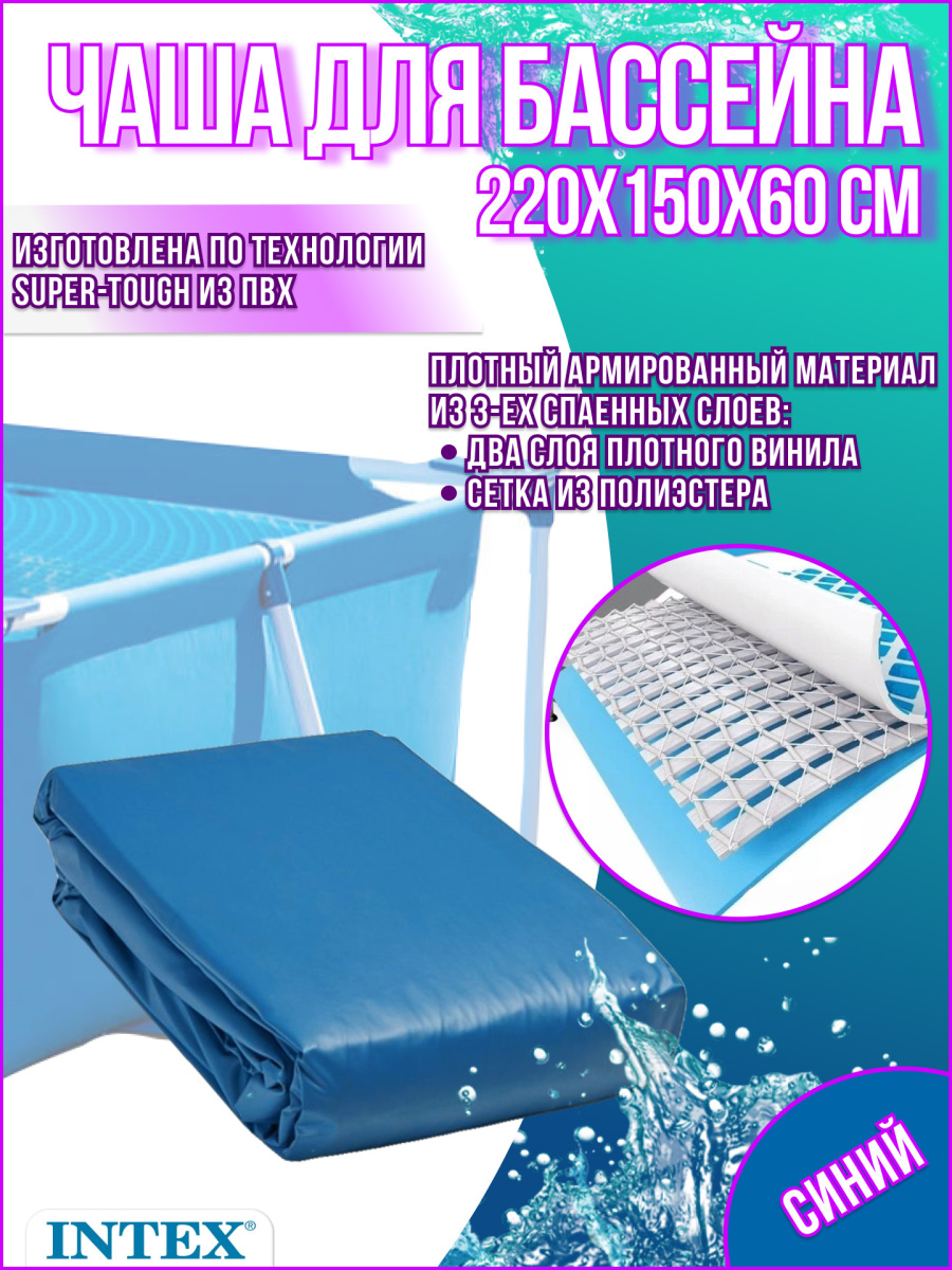 Чаша 10942 для каркасных прямоугольных бассейнов Intex имеет размеры 220x150x60 см и предназначена для бассейнов серии Metal Frame.Изготовлена по технологии SUPER-TOUGH из ПВХ. Это плотный армированный материал из трех спаенных слоев: два слоя плотного винила и сетка из полиэстера. Такое сочетание наделяет материал огромным запасом прочности. В чаше имеются отверстия для подключения фильтрационного оборудования и сливной клапан снизу. Если по какой-либо причине чашковый пакет вашего бассейна вышел из строя и не подлежит ремонту - эта чаша позволит сэкономить на покупке нового каркасного бассейна Intex и за небольшие деньги восстановить бассейн. Совместима с бассейнами Intex размером 220х150х60 см