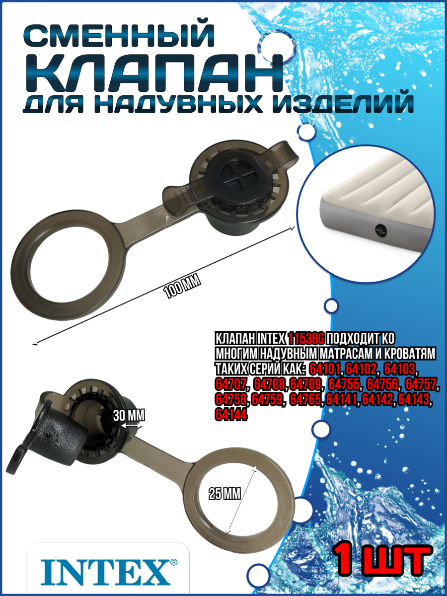 Клапан сменный Intex 11538G для надувных изделий: кровати, матрасы, диваны и кресла, детские надувные бассейны. Клапан Intex 11538G подходит ко многим надувным матрасам и кроватям таких серий как: 64101; 64102; 64103; 64707; 64708; 64709; 64755; 64756; 64757; 64758; 64759; 64765; 64141; 64142; 64143; 64144. Дополнительные клапаны для матрасов ПВХ Intex рекомендуется приобретать в качестве запасных на случай утери или случайной порчи клапана, который идет в комплекте с изделием. Клапан изготовлен из плотной резины и в случае длительной эксплуатации в течение нескольких лет может терять свою эластичность, поэтому изделие приходится чаще подкачивать с помощью насоса - в этом случае гораздо проще приобрести запасной клапан, чем менять целиком вашу кровать или матрас.