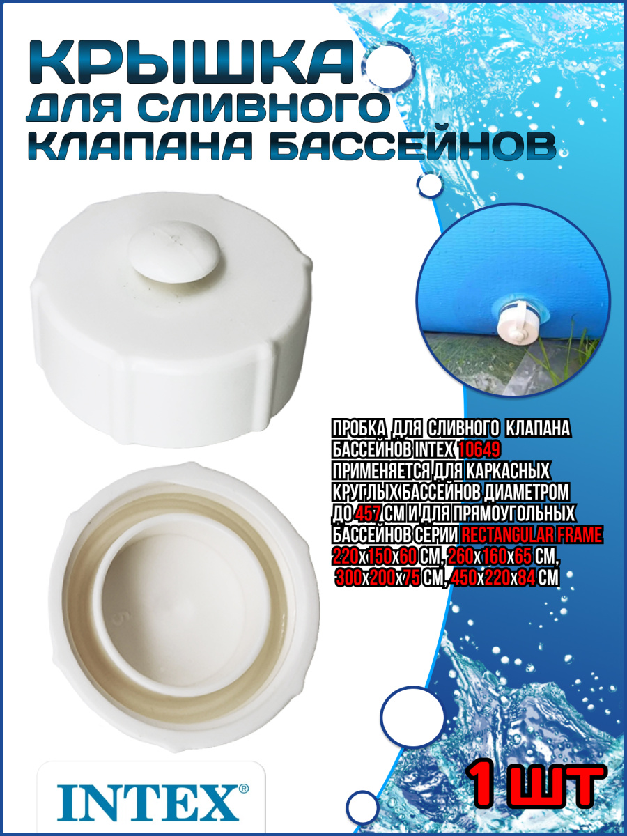 Пробка для сливного клапана бассейнов Intex 10649 применяется для каркасных круглых бассейнов диаметром до 457 см. и в прямоугольных бассейнов серии Rectangular Frame 220x150x60 см, 260x160x65 см, 300x200x75 см, 450x220x84 см