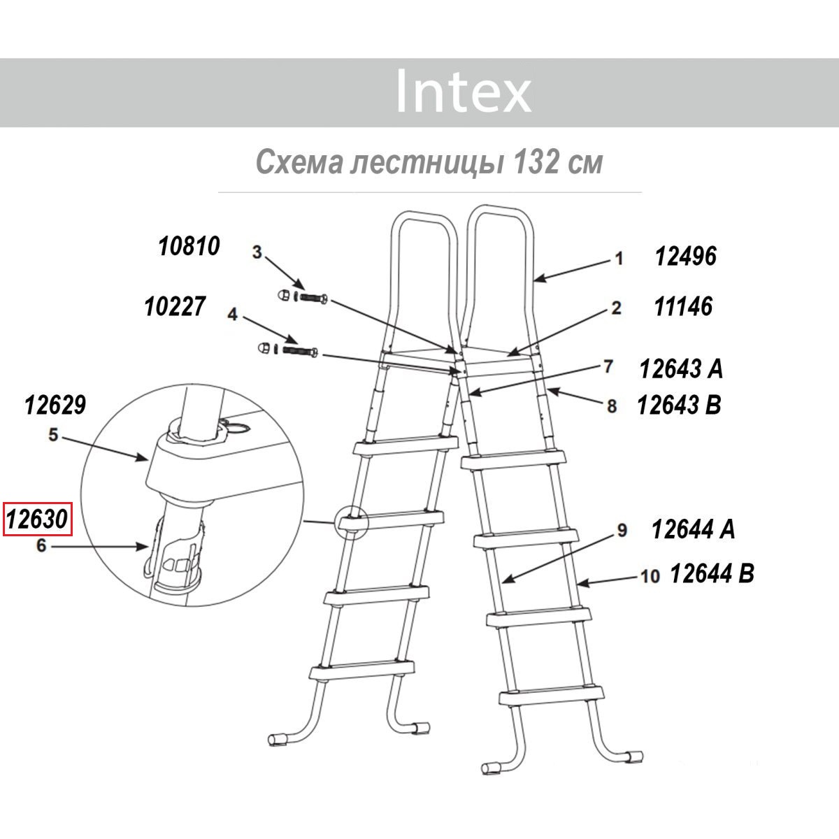 Фиксатор ступенек Intex 12630 используется для фиксации ступеньки 12629 в лестницах 28064, 28065, 28066, 28067, 28075, 28076, 28077.