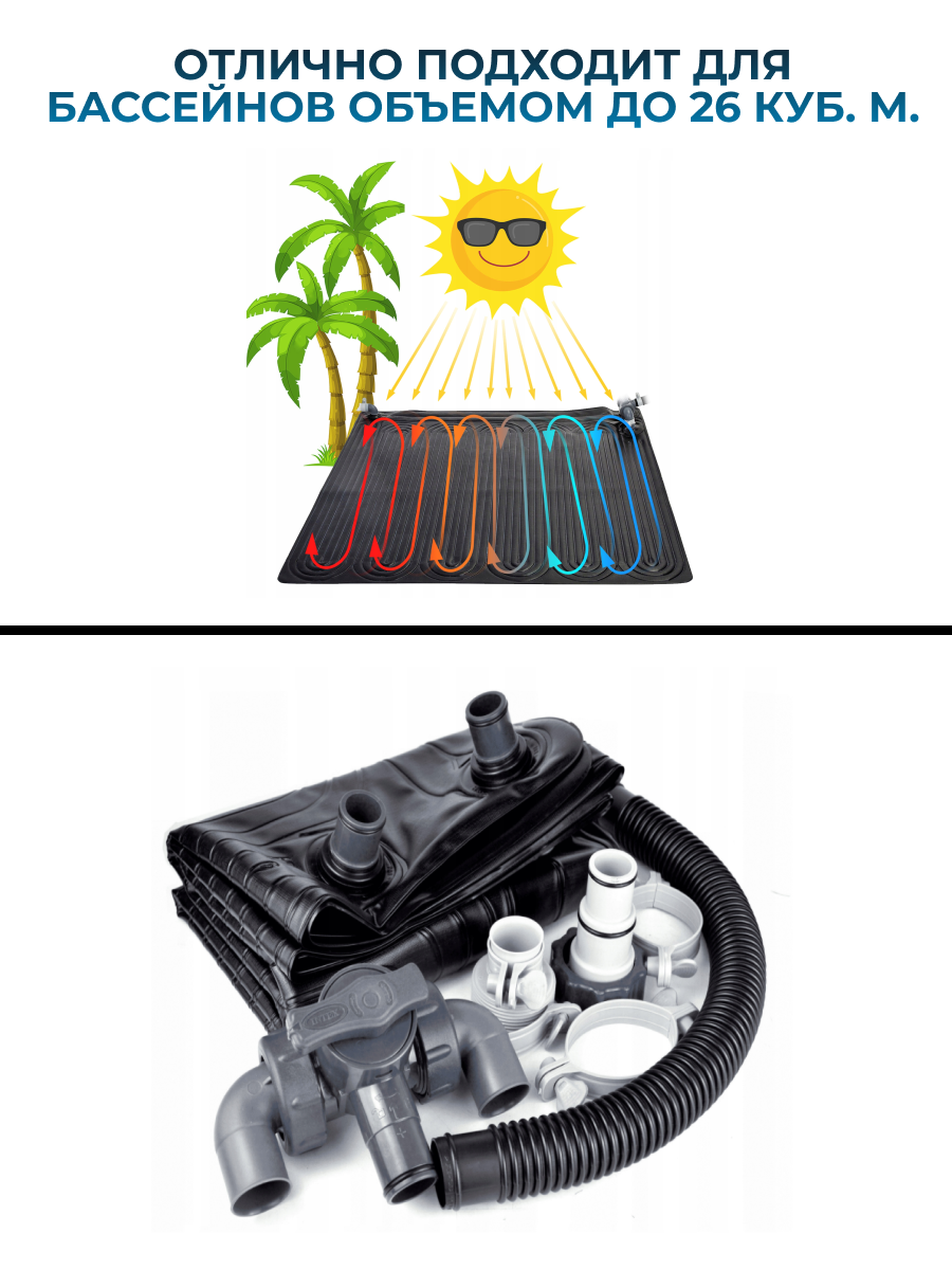 Солнечный нагреватель воды проточного типа "Solar Mat 28685 " совместим с любыми сборными бассейнами оснащенными системой фильтрации. С такими нагревателями температура воды в бассейне повышается примерно на 3-5 C от температуры окружающей среды.