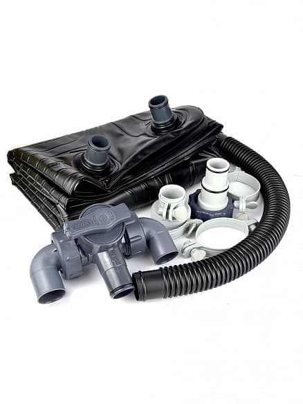 Панель - 1 шт Клапан потока воды - 1 шт Гофрированный шланг диаметром 32 мм и длиной 0.5 м - 1 шт Переходник для подключения к шлангам 38 мм с резьбовым соединением - 2 шт Набор хомутов для утяжки шлангов 32 мм - 1 шт