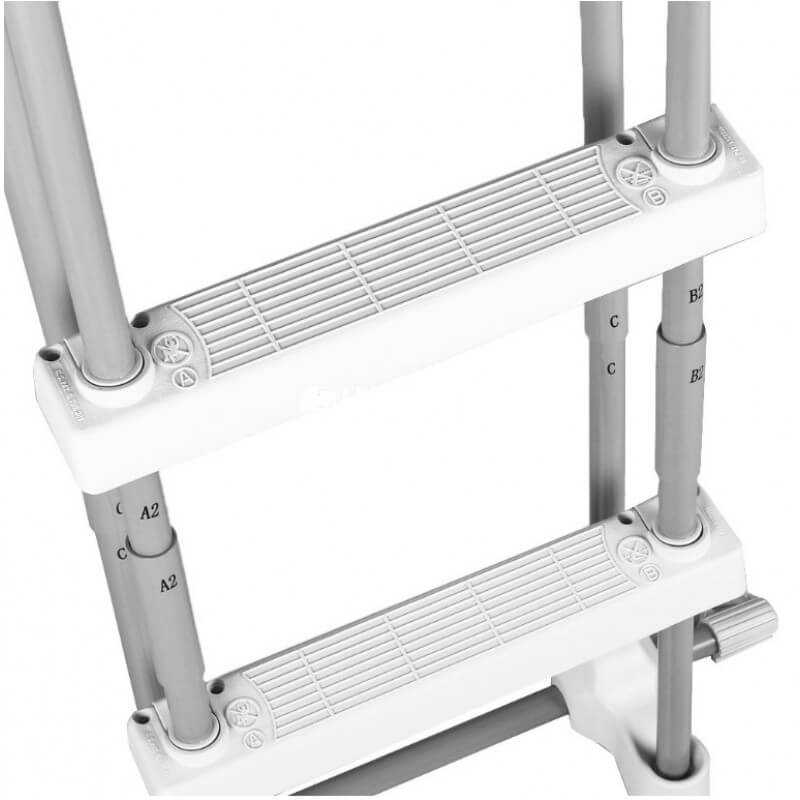 Усиленная двусторонняя лестница Intex 28075 для надувных и каркасных бассейнов высотой до 107 см. Выполнена из металлических стоек с покрытием из порошкового напыления от ржавчины и истирания. Лестница оборудована съемными ступеньками, которые быстро снимаются и устанавливаются в вертикальное положение, когда бассейн не используется. Это необходимо для ограничения доступа к бассейну детям. Ступени выполнены из усиленного пластика. Лестница довольно простая в использовании, она долго хранится и имеет длительный срок эксплуатации.