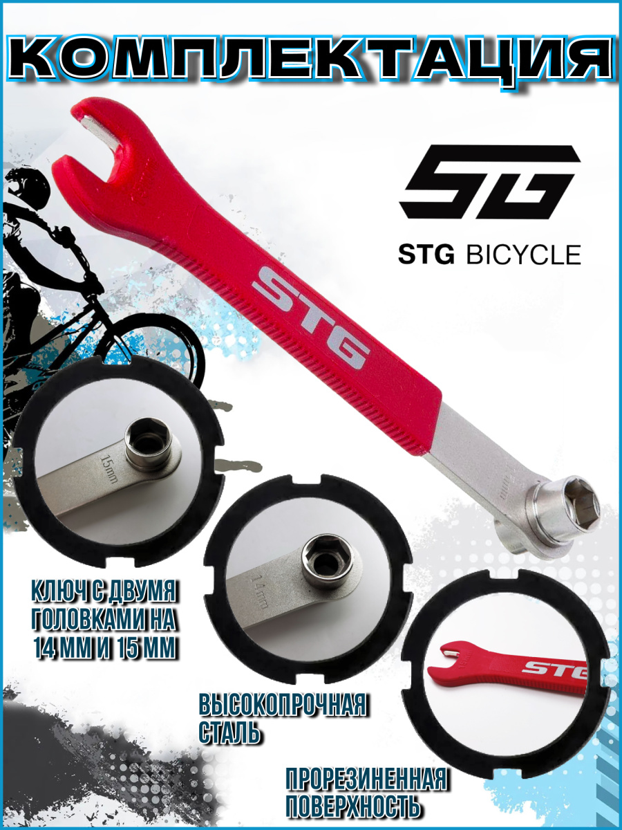 Ключ педальный STG YC-161. Выполнен из качественной прочной стали, покрыт резиной красного цвет вплоть до губок ключа для педалей, чтобы не только повысить удобство пользования но и предохранить шатуны от царапин. Педальный ключ на второй стороне имеет две головки на 15 и 14 мм, для откручивания гаек колес и болтов шатунов.