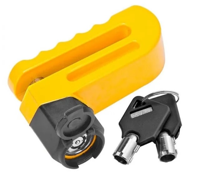 Замок 83217 на дисковый тормоз противоугонный жёлтый, длина паза 70 мм, ширина паза 8 мм, диаметр штыря 10 мм, с защитой от грязи на замочной скважине