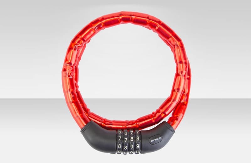 Трос-замок 81601 с шифром 4 цифры, со стальными звеньями, 18x1000 мм, красный