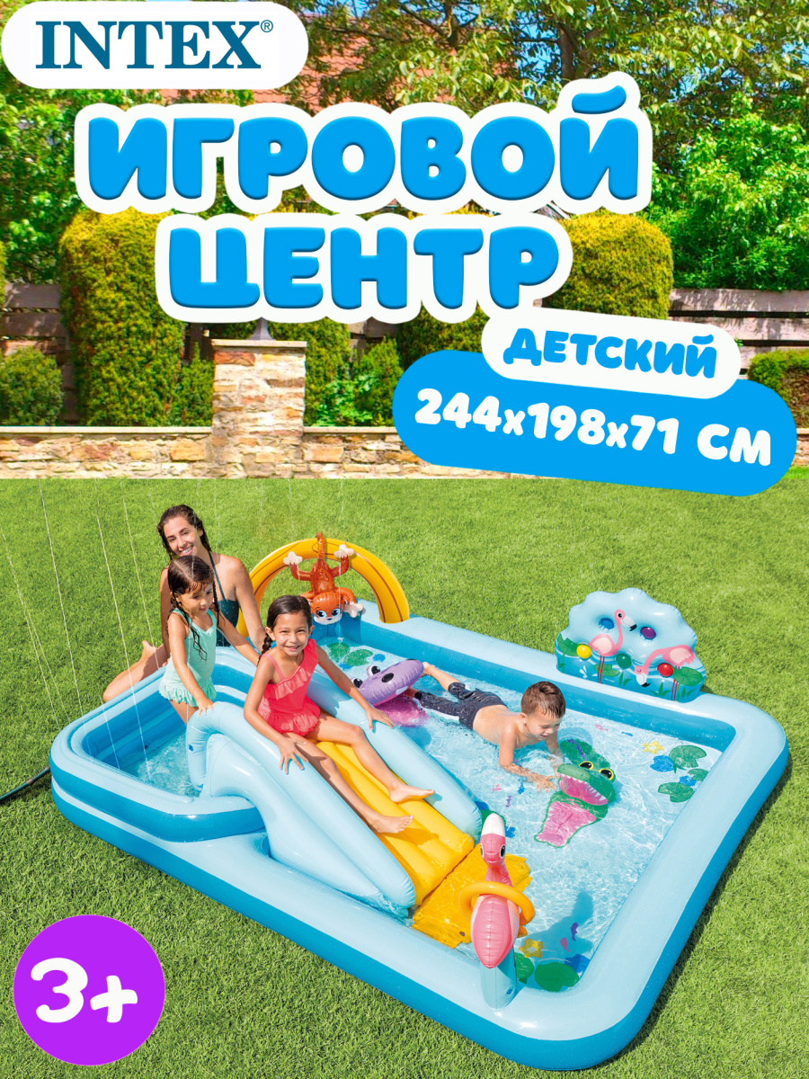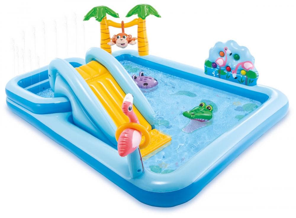 Детский игровой бассейн Интекс- это надувная горка с бортиками, озорная обезьянка, крокодил, бегемот и фламинго, который может использоваться в качестве кольцеброса. Горка заканчивается надувной подушкой, чтобы дети не ударились о землю. Неоспоримым плюсом водного игрового центра являются два бассейна разной величины. В комплекте 5 пластмассовых мячиков разных цветов, которые могут храниться в надувном элементе на бортике большого бассейна.