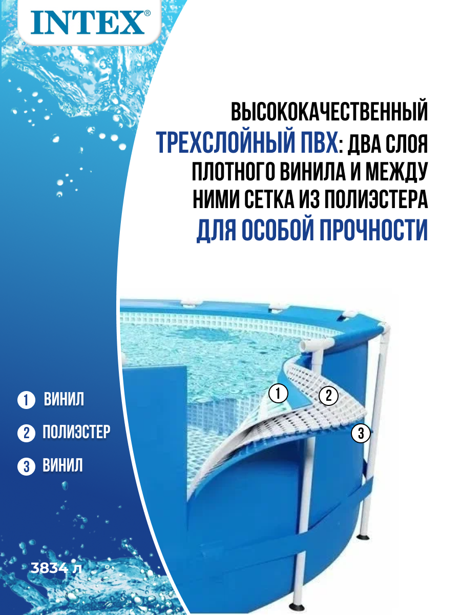 Прочность бассейна INTEX METAL FRAME POOL обуславливается его металлическим каркасом, благодаря которому бассейн выдерживает большие нагрузки. Поддержанию формы способствует лента из полипропилена, «опоясывающая» весь бассейн.