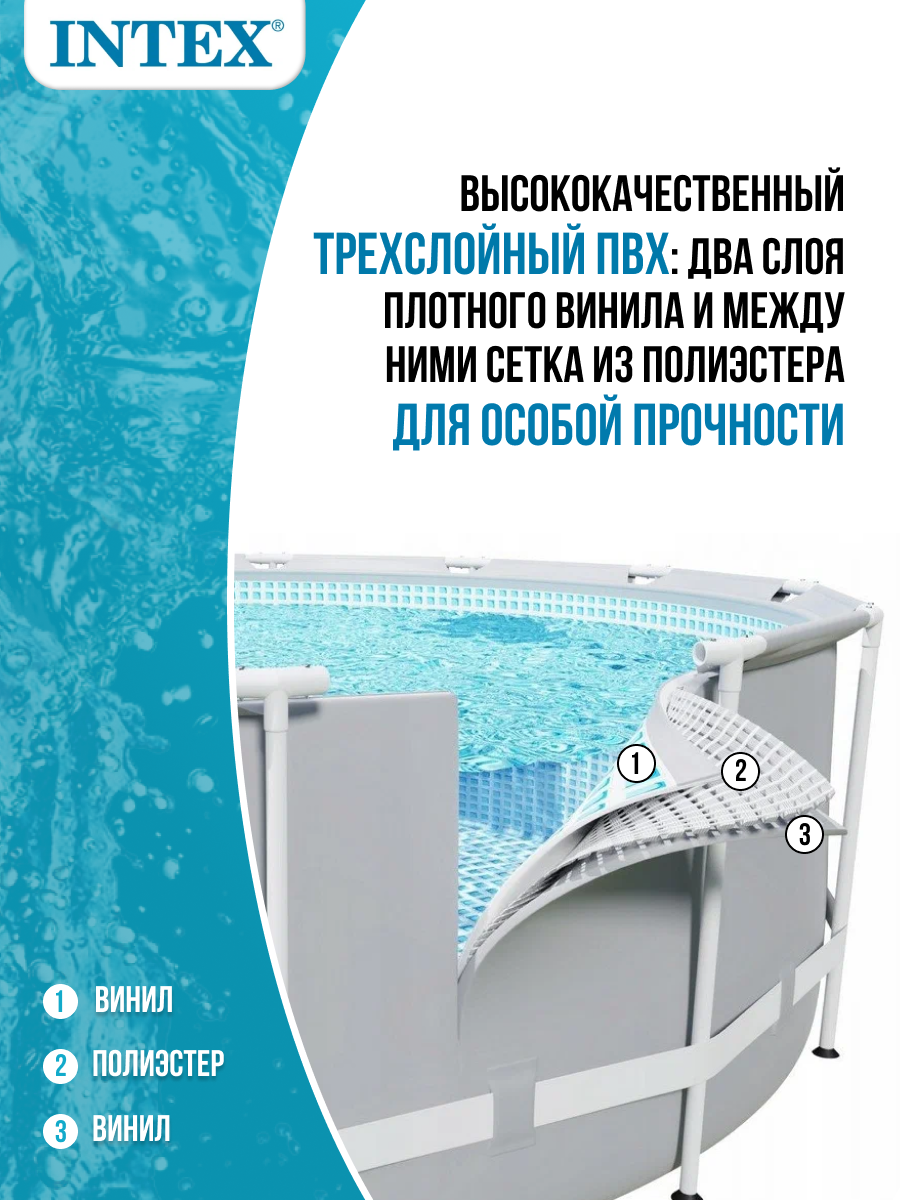 Сборные каркасные бассейны Intex Prism Frame Pool с простой, стабильной и надёжной конструкцией. Улучшенная кострукция каркаса и цвет чаши - основные отличия от бассейнов серии Metal Frame. Стойки каркаса имеют овальное сечение, что увеличивает надёжность конструкции. Особый метод порошкового напыления защищает металлические детали каркаса от окислений и ржавчины. Технология Super-Touch (сочетание винила и полиэстра), используемая в производстве, наделяет материал тройной прочностью, стойкостью к ударам, воздействию солнечного света, растягиваниям и стираниям.