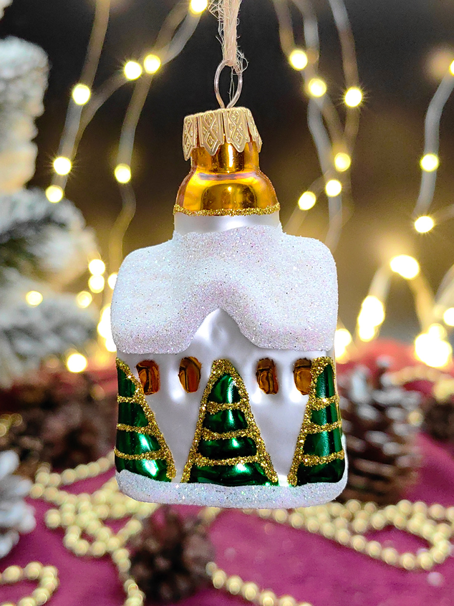 Елочная игрушка Домик белый/зеленый 7 см, стекло // домик