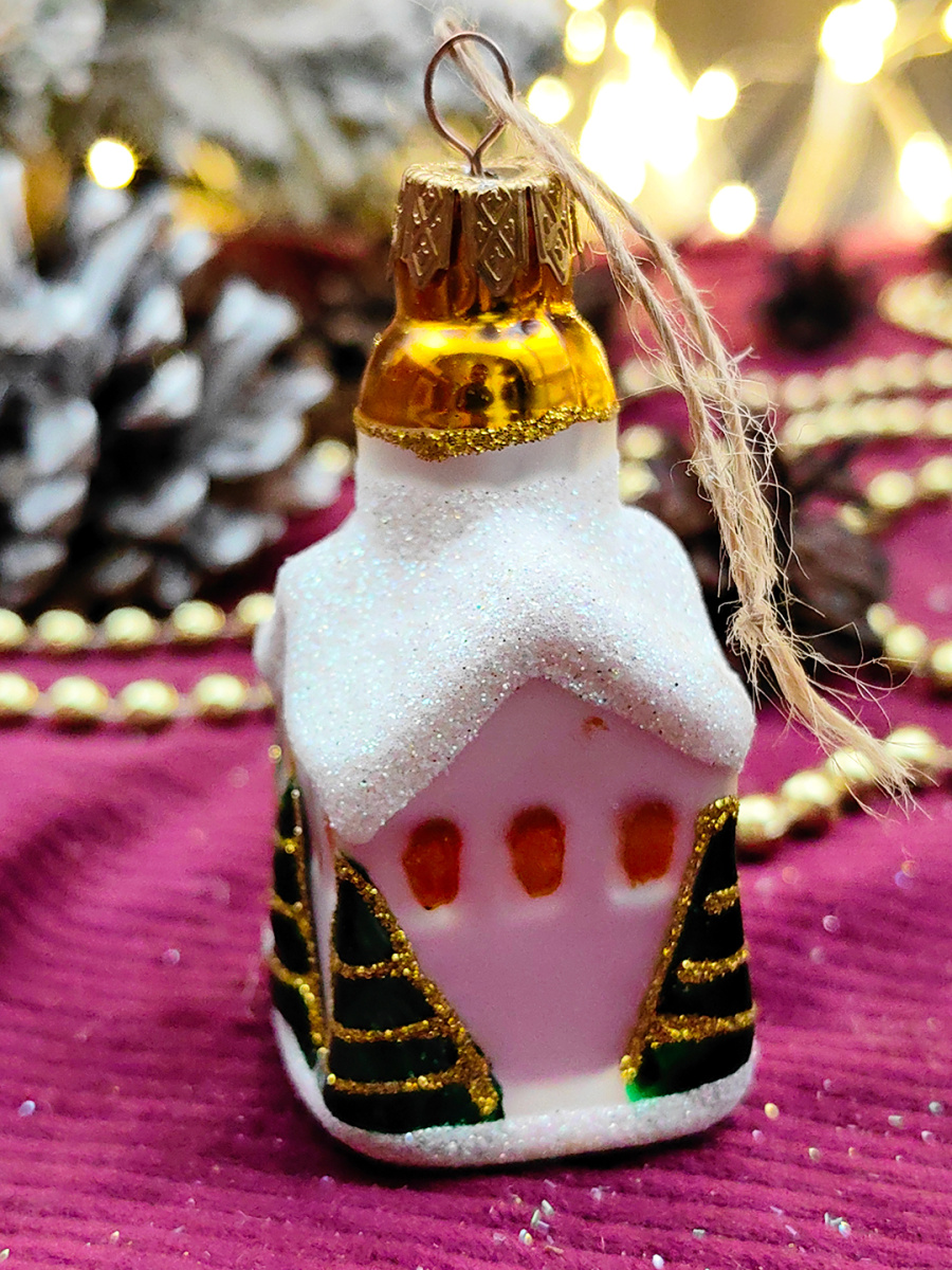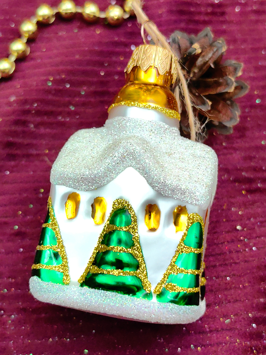 Елочная игрушка Домик белый/зеленый 7 см, стекло  // домик