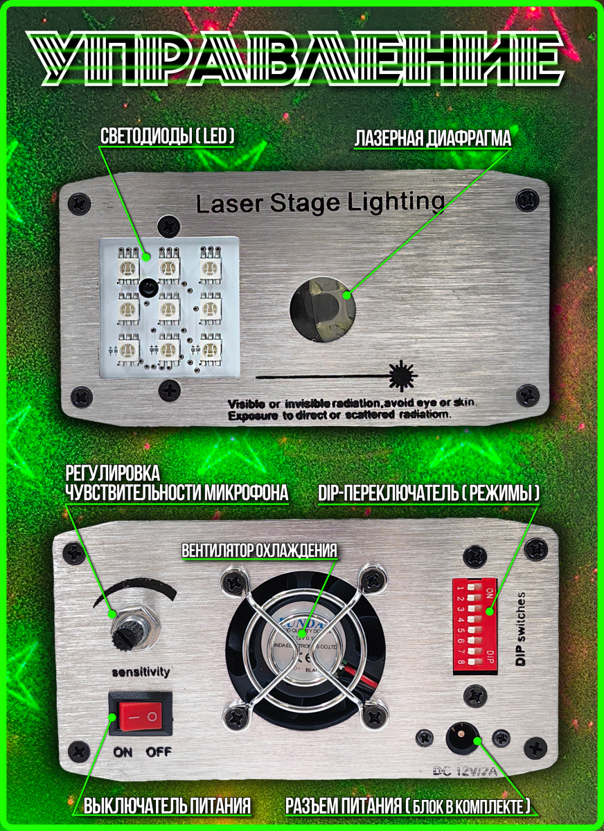 Данная модель Laser Stage Lighting LSS-020 оснащена 9 светодиодами, которые образуют фон для лазерных узоров, то есть не оставляет пустот. Цвета диодов меняются и отлично дополняют образуемый эффект. На пульте есть кнопка включения и выключения этой функции.