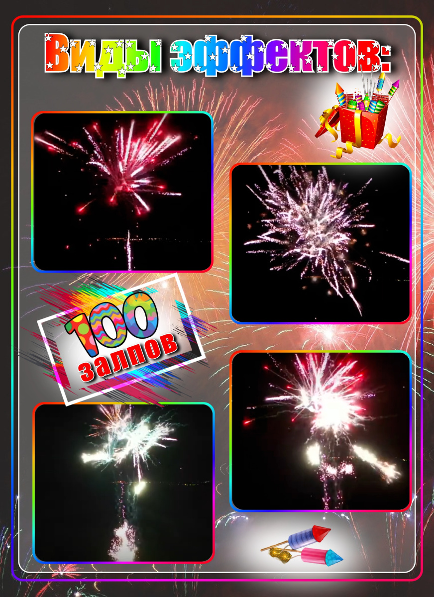 Ваш праздник украсят 100 залпов калибром 0.8"(20мм), радуя вас эффектами, среди которых: Серебряный хвост, серебряная волна, красные звезды; спиралевидный хвост, белое мерцание; серебряный хвост, серебряная волна, голубые звезды; серебряный хвост, серебряная волна, треск. Незабываемые 48 секунд впечатляющего пиротехнического шоу!