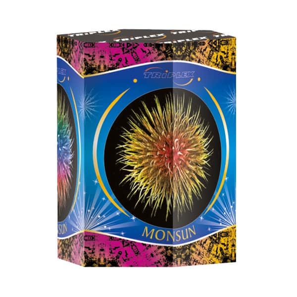 Эффект большие, золотые звезды завершаются зелеными, красными и синими мигающими точками, разнообразными, маленькими трескающимися звездами, в финале три звезды одновременно, каждая с кончиками разного цвета